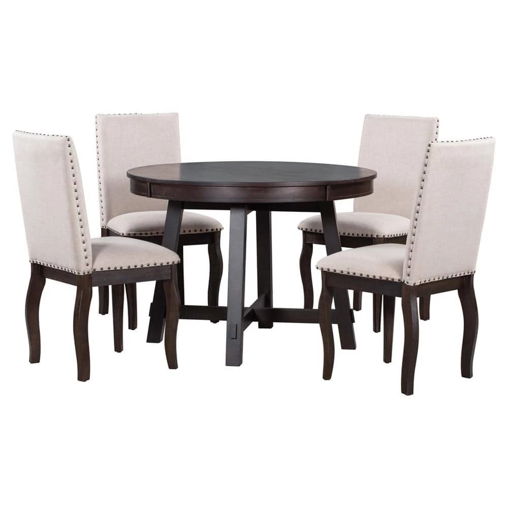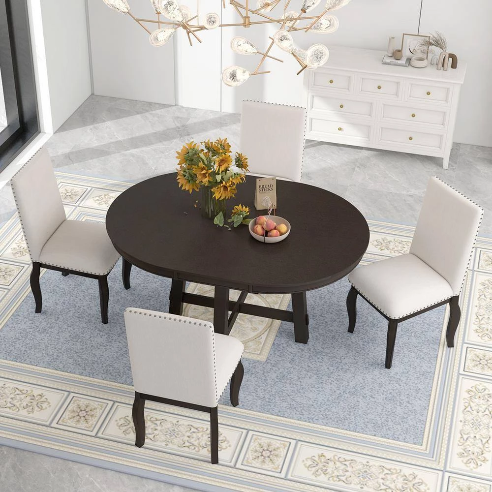 - With round tabletop and special curved chair legs, this 5-piece dining table set represents a elegant and temperament atmosphere.