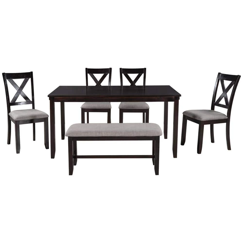 This Rectangular dining table set gives 4 wooden dining chairs, 1 dining table and 1 fabulous dining bench which can fully accommodate your family. Offer a touch of elegance to your dining area with our wooden dining table set.Ideal for dinette, kitchen, and dining areas, this multi-functional dining set seats up to 6 people, perfect for families to enjoy meal times together.