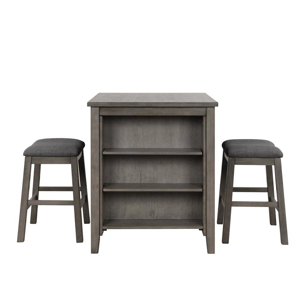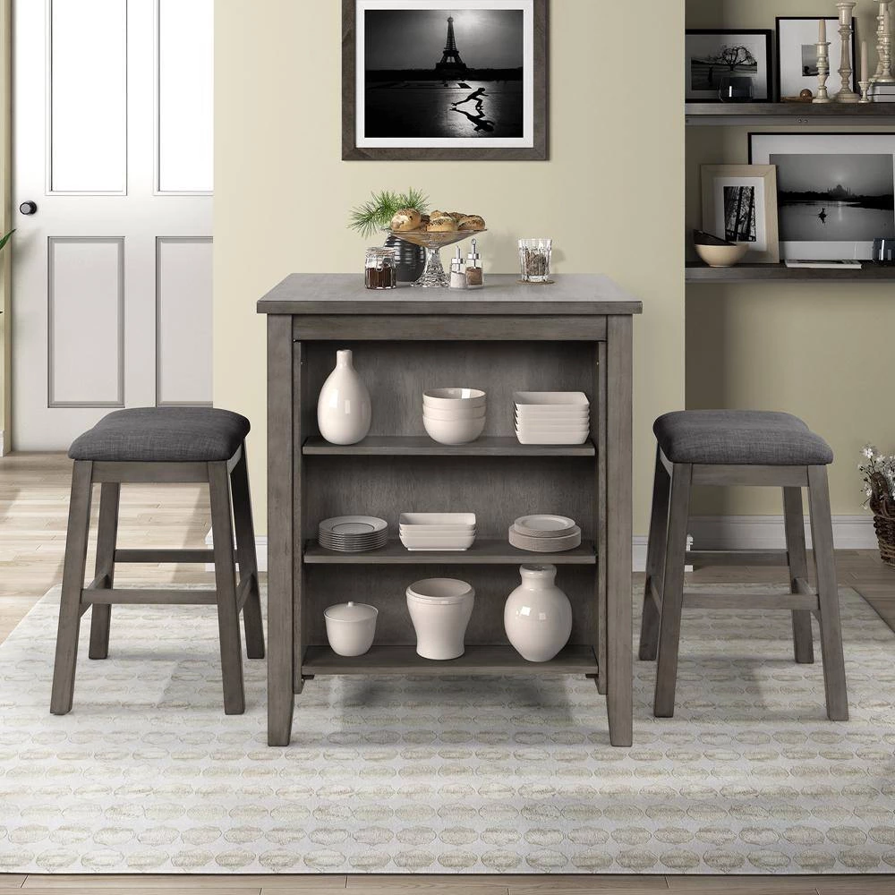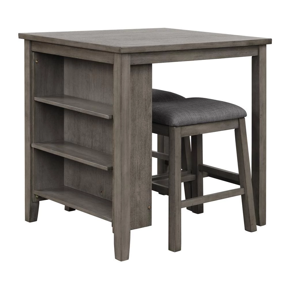 3 Piece Square Dining Table with Padded Stools, Table Set with Storage Shelf, Dark Gray. Add some rustic charm to your space with this 3-piece square dining table set. Finished in a gray weathered pattern, this piece will enhance your home with its unique natural appeal while effortlessly transforming your kitchen, den or dining room into a more comfortable space.