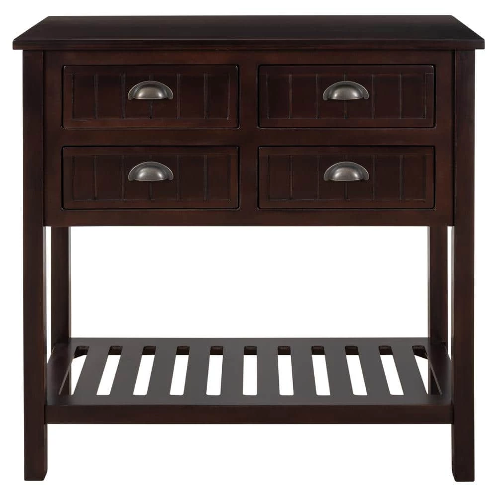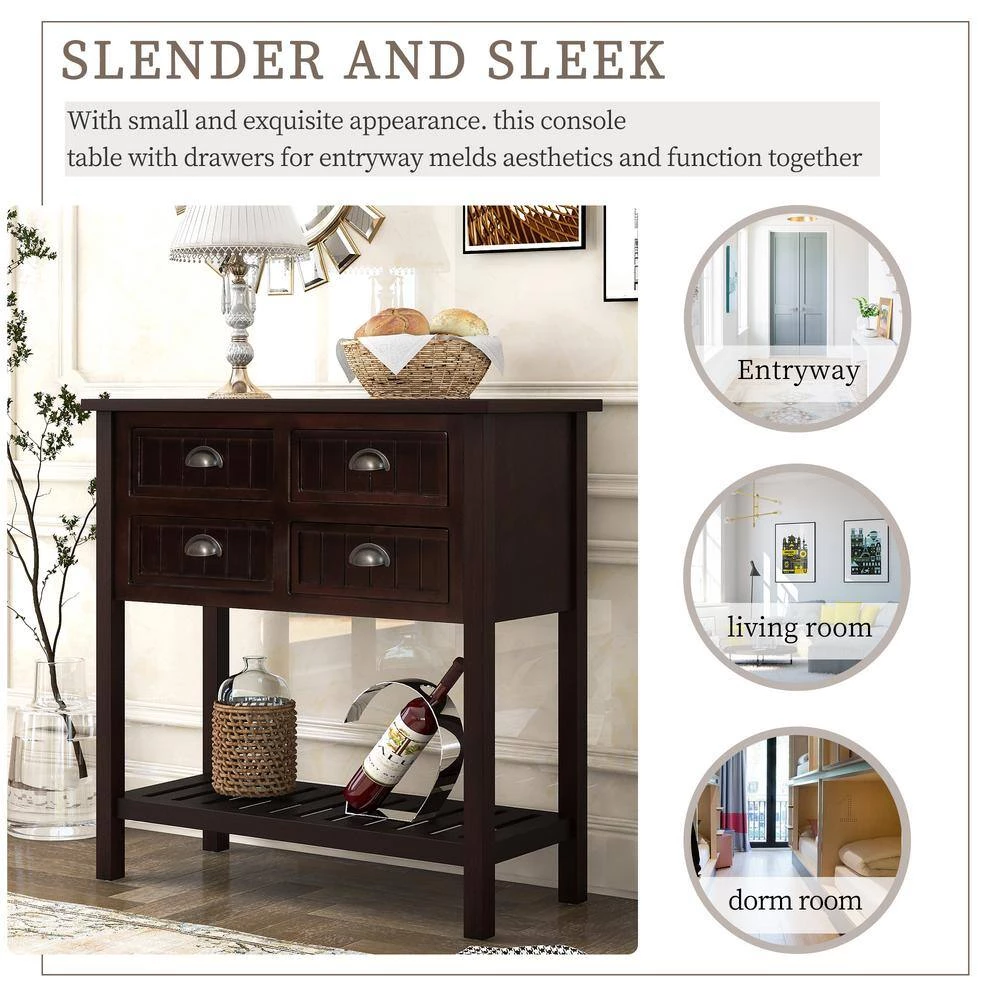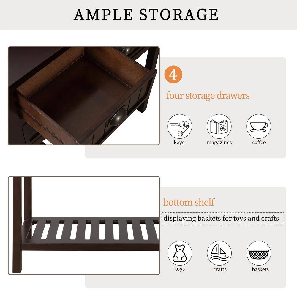 - Ample Storage: Features four storage drawers, open table top and slatted lower shelf, sofa table provides ample storage space for your personal belongings. You can place things like lamps for extra lighting, decors for style, and store keys, coffee cups and magazines in four drawers. bottom shelf is ideal for displaying baskets for toys and crafts.