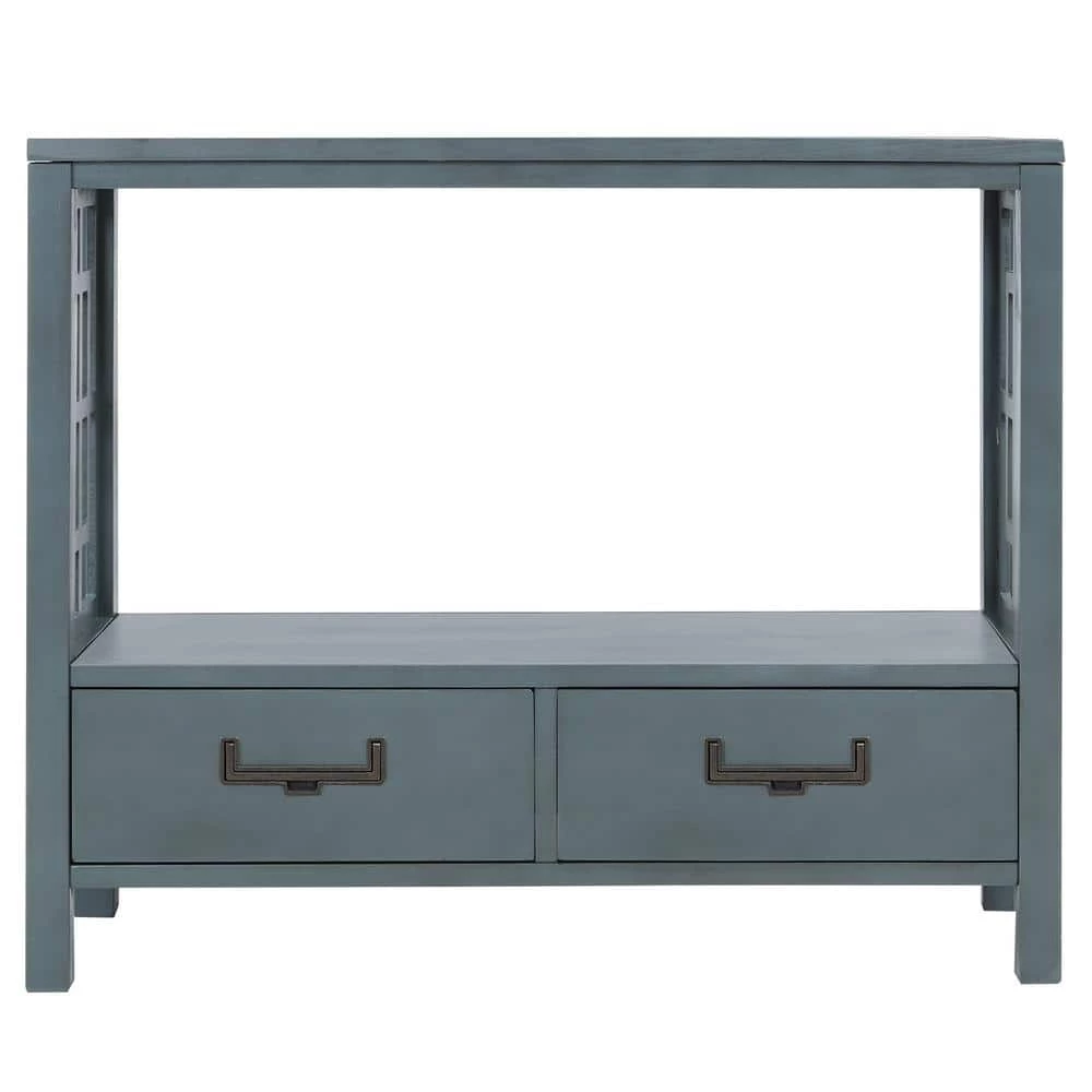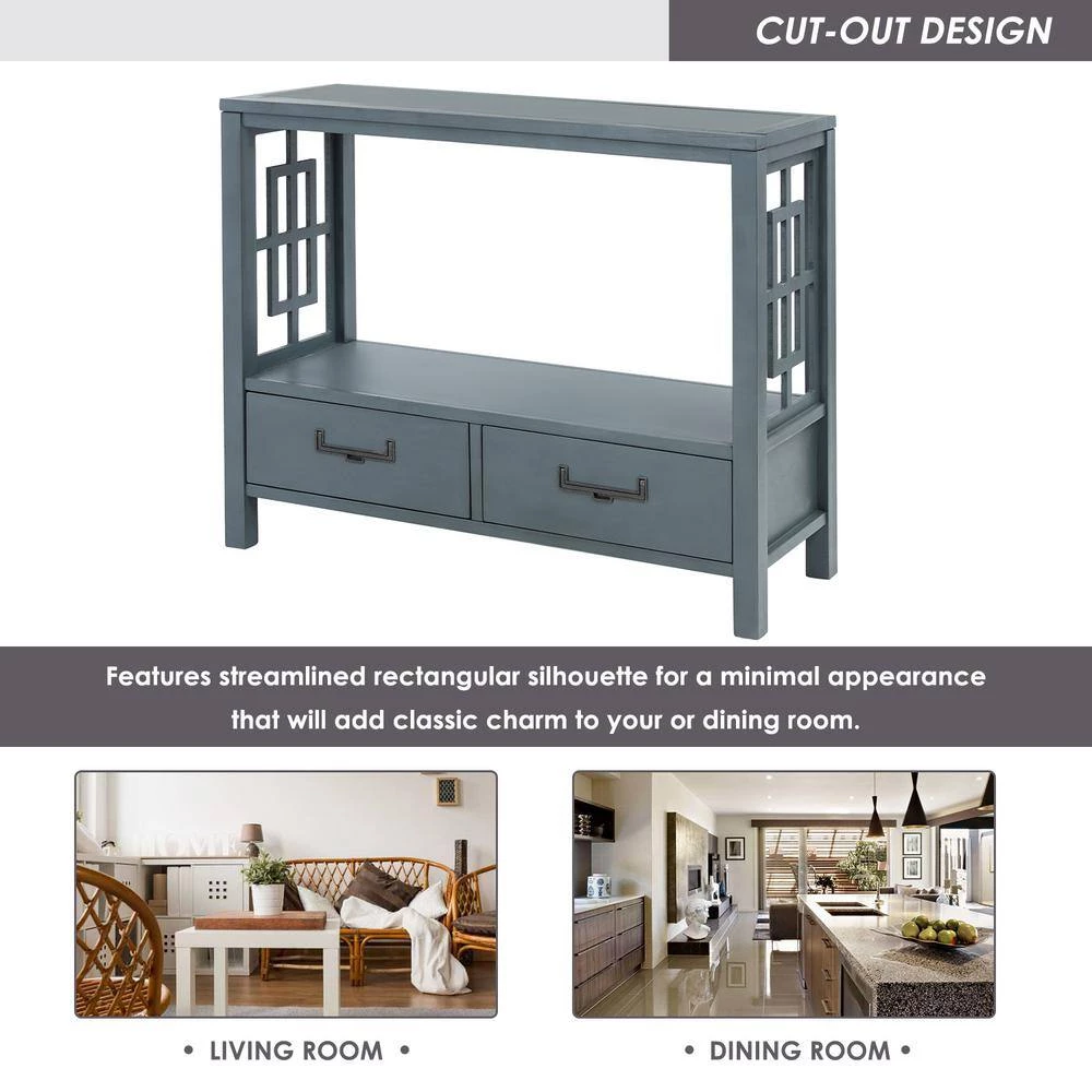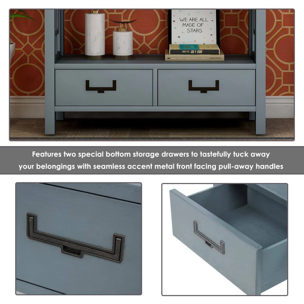 Features streamlined rectangular silhouette for a minimal appearance that will add classic charm to your living room or dining room. Quality wood construction built with a 100% high-grade solid wood frame for heightened longevity and storage capacity. Features 2-special bottom storage drawers to tastefully tuck away your belongings with seamless accent distressed metal front facing pull-away handles.