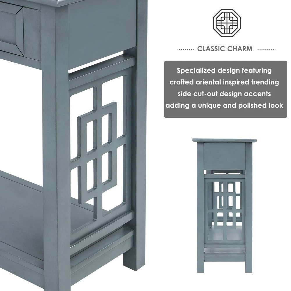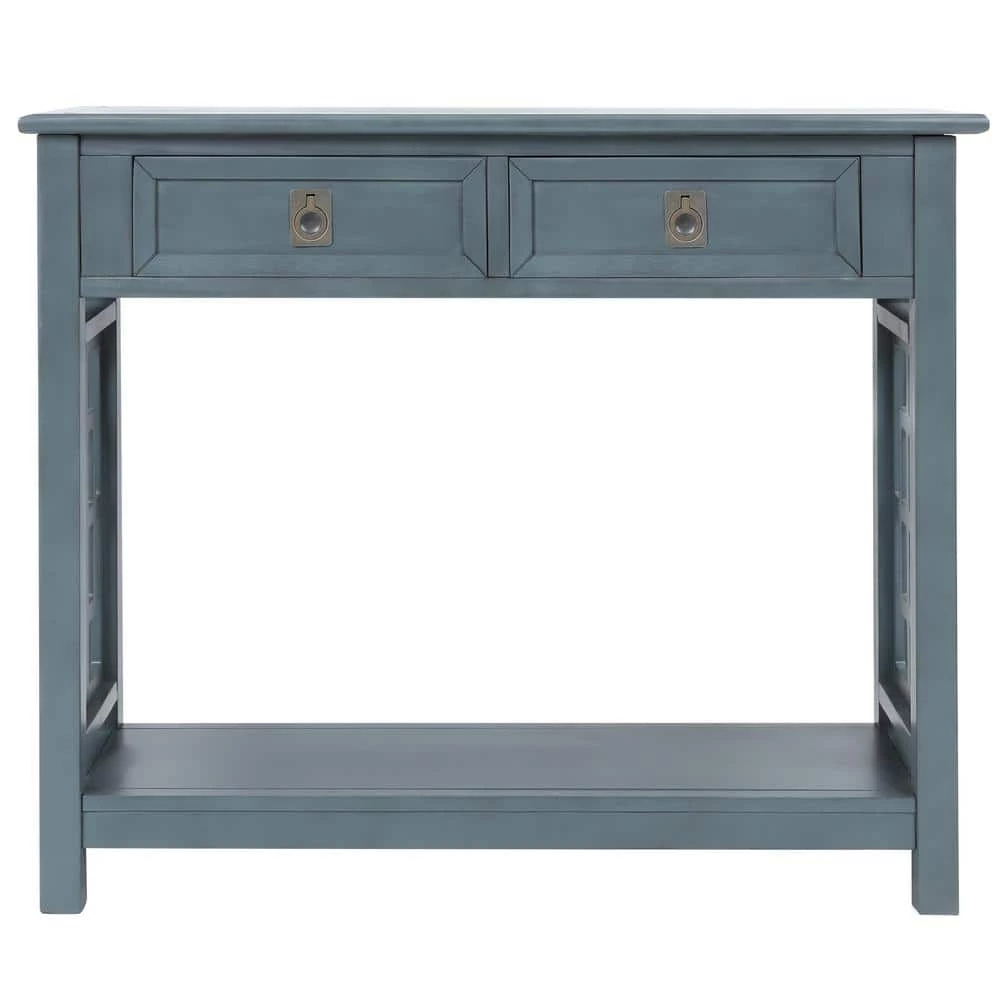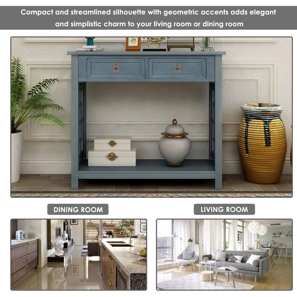 - Console table for storage and displaying decor complete with a spacious bottom shelf and two upper storage drawers with seamless iron knobs that can flip out
