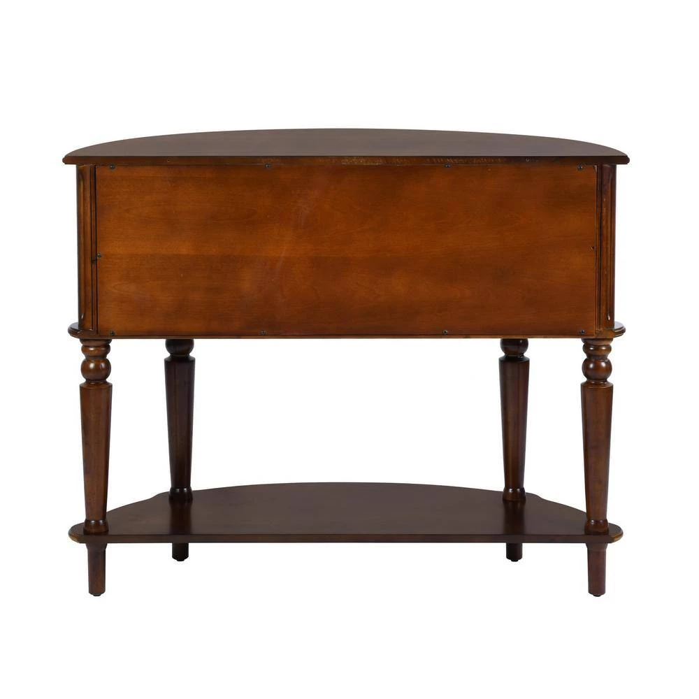 A console table is a versatile accent that works in many places in a home: from an entryway to cluttered living room and beyond, the console table offers room to display decor pieces while also clearing up clutter. Crafted from solid wood, it showcases four turned legs and strikes a semicircular silhouette. And with a neutral rich brown finish, it blends well with a variety of design aesthetics and color palettes.