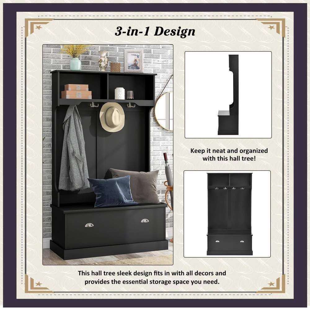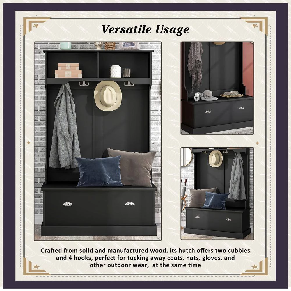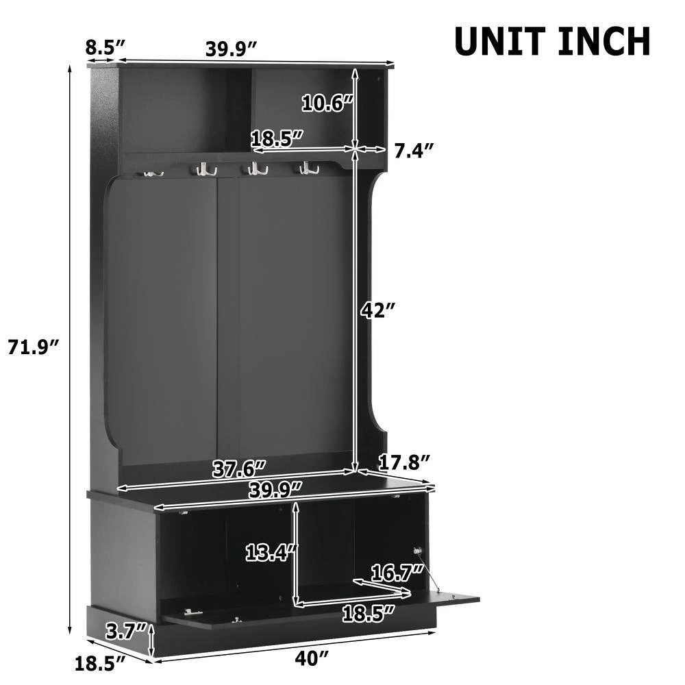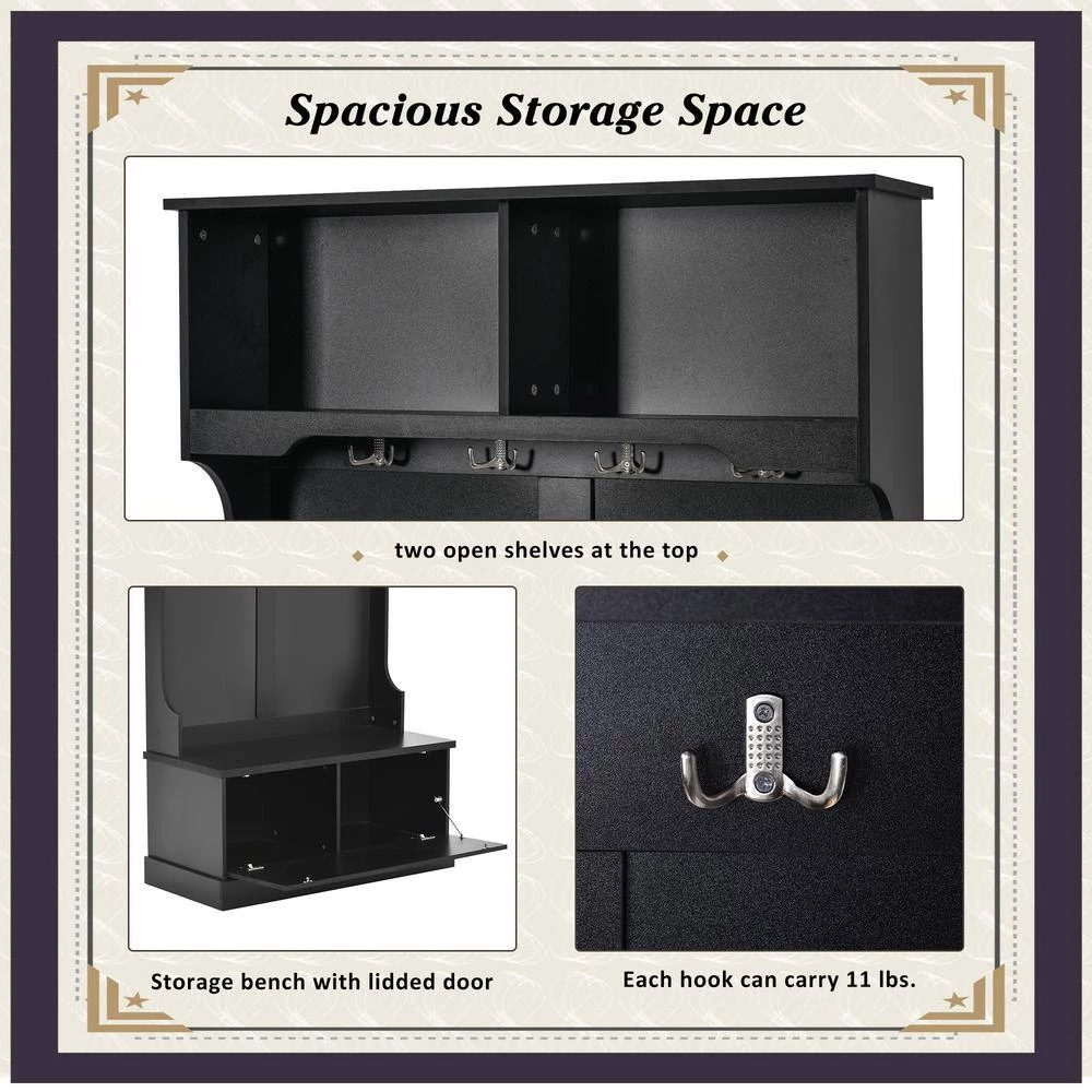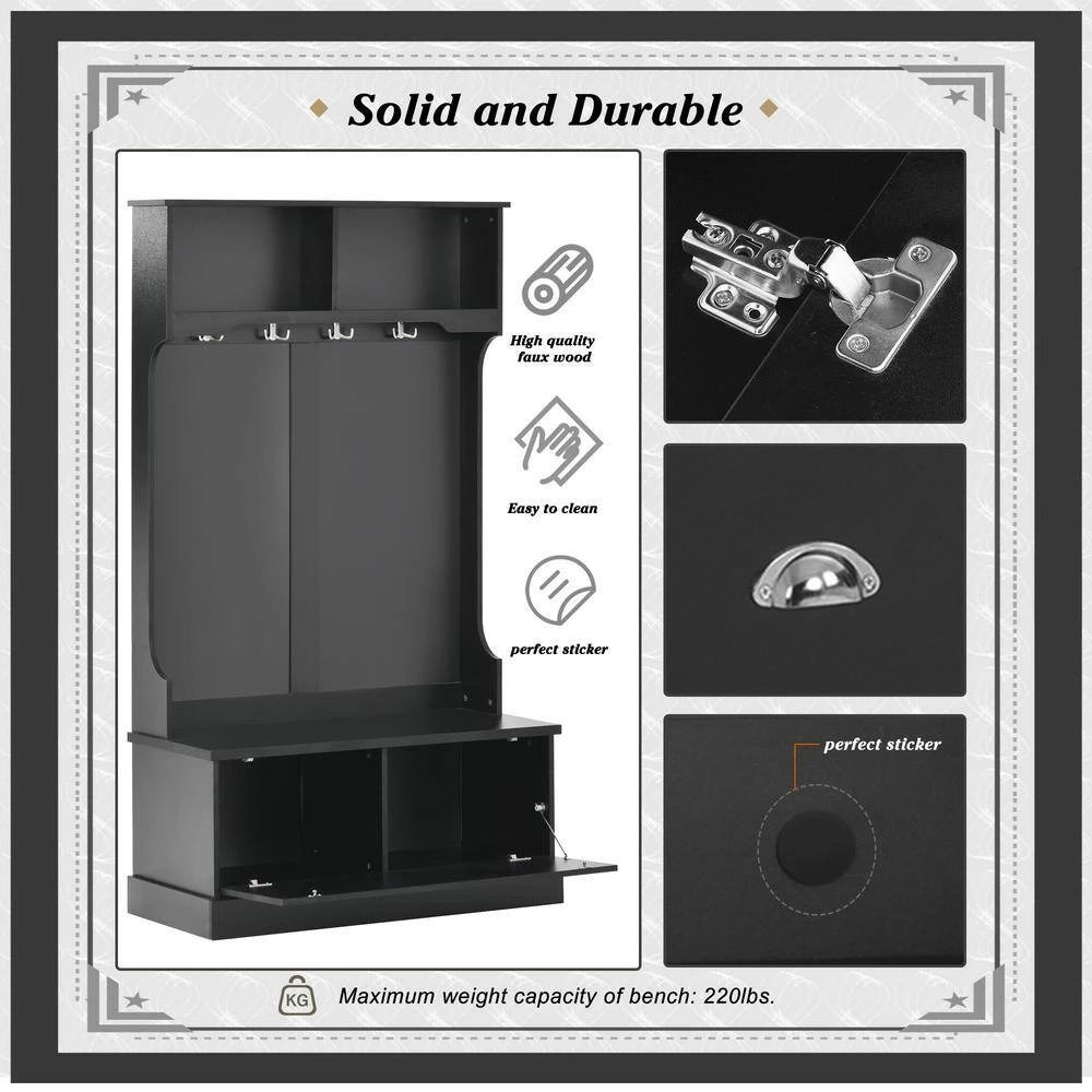 - Spacious Storage Space:Crafted from solid and manufactured wood, its hutch offers two cubbies and several hooks, perfect for tucking away coats, hats, gloves, and other outdoor wear, at the same time the bench features a Hinged drop-down cabinet door that opens to reveal even more storage space, while lend you a seat to pull on your boots.
