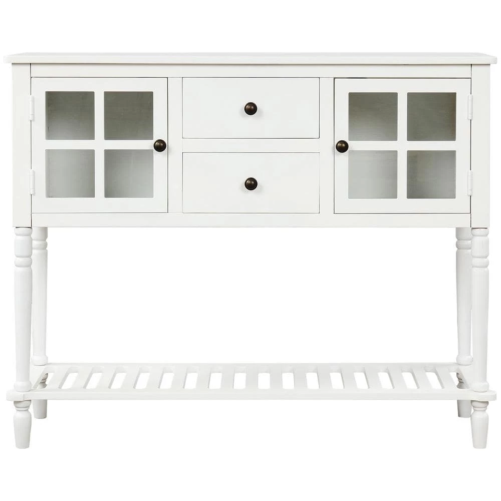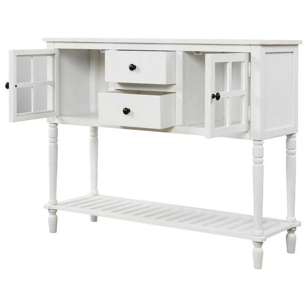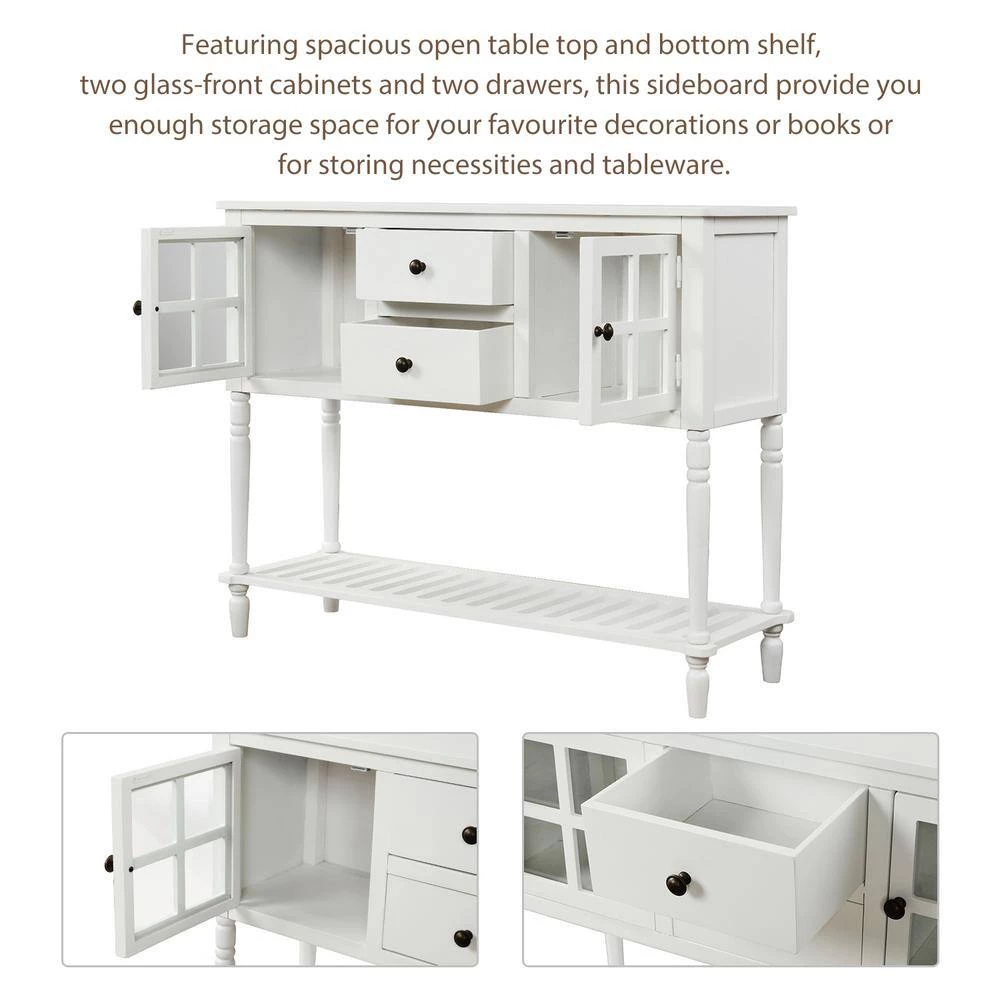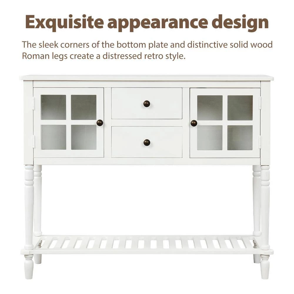 Featuring spacious open table top and bottom shelf, two glass-front cabinets and 2-drawers, this sideboard provide you enough storage space for your favorite decorations or books or for storing necessities and tableware. Exquisite appearance design, the sleek corners of the bottom plate and distinctive solid wood Roman legs create a distressed retro style. Easy assemble, simply attach the four base legs and bottom shelf.