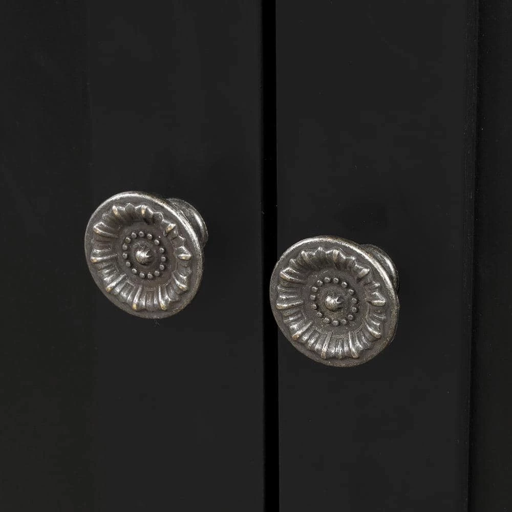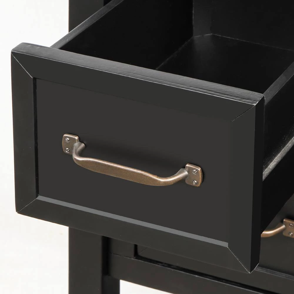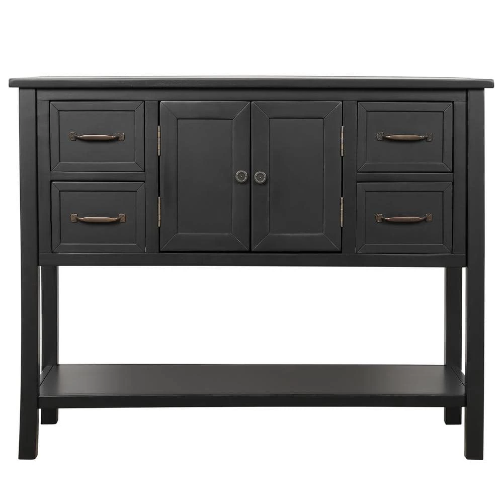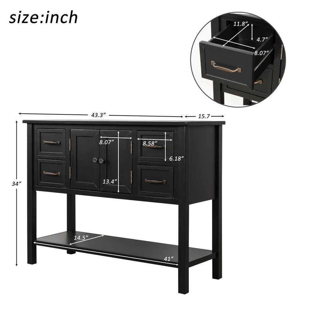 Effortlessly fill in that blank space in your home with this console table, designed to fit all of your needs and more. Crafted with a classic vintage appearance, this table comes complete with two front facing cabinet doors that open to reveal a spacious interior, perfect for stowing away your larger necessities and keeping them out of sight. The 4 matching compact side drawers minimize clutter, offering plenty of space to hold smaller items such as keys or mail while the spacious bottom shelf is the perfect place for storage baskets, shoes and more. Crafted with thick Pine and MDF wood slabs and accented with quality iron handles, this piece is manufactured for quality and exudes a high-end appeal that will leave your guests talking.