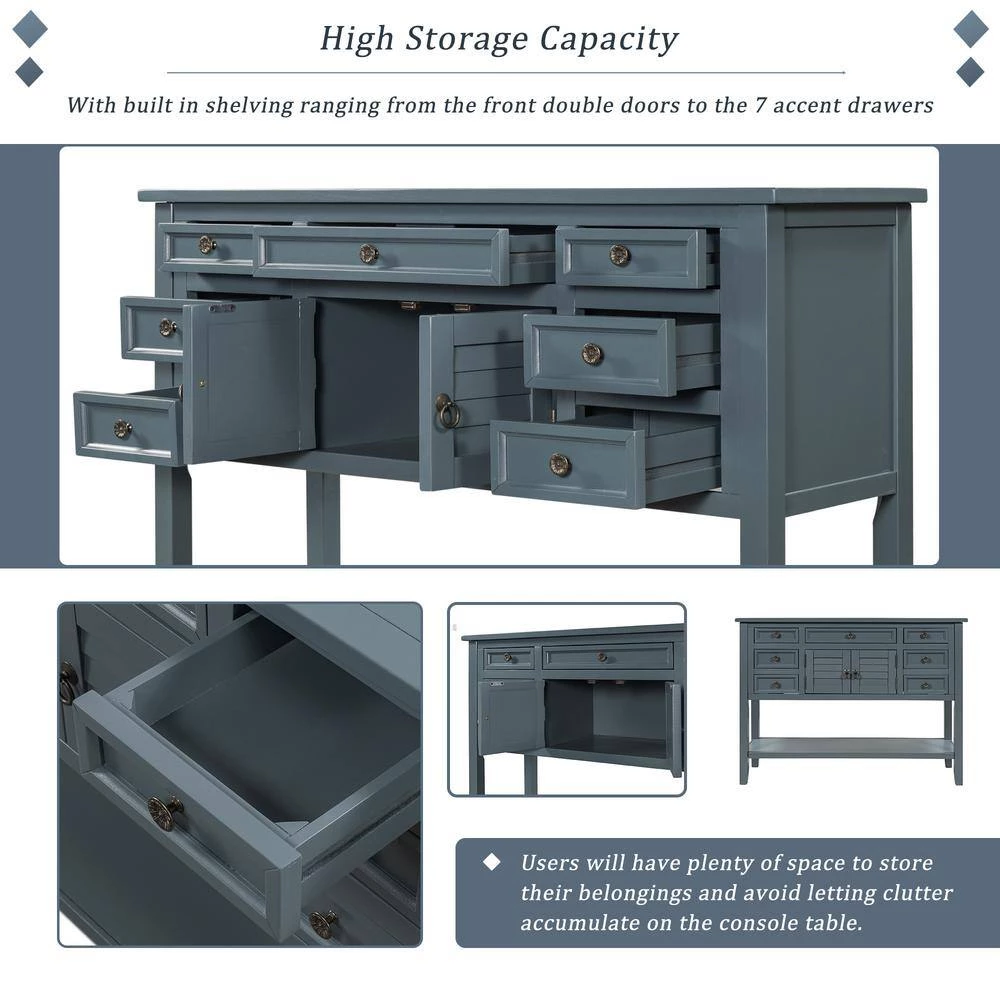 - High storage capacity, with built in shelving ranging from front double doors to 7 accent drawers, users will have plenty of space to store their belongings and avoid letting clutter accumulate on console table
