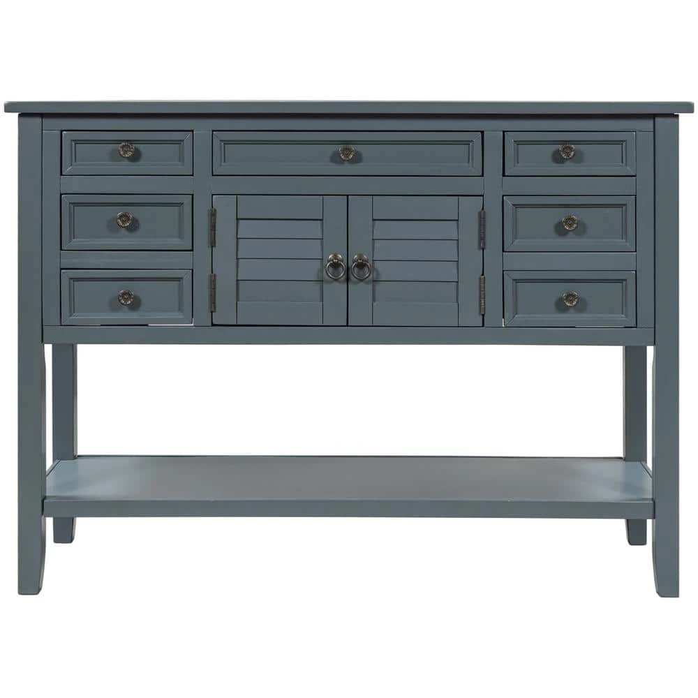Effortlessly fill in that blank space in your home with this console table, designed to fit all of your needs and more. Crafted with a classic vintage appearance, this table comes complete with 2-front facing cabinet doors that open to reveal a spacious interior, perfect for stowing away your larger necessities and keeping them out of sight. The 6-matching compact side drawers and 1-middle drawer minimize clutter, offering plenty of space to hold smaller items such as keys or mail while the spacious bottom shelf is the perfect place for storage baskets, shoes and more. Crafted with thick Pine and MDF wood slabs and accented with quality iron handles, this piece is manufactured for quality and exudes a high end appeal that will leave your guests talking.