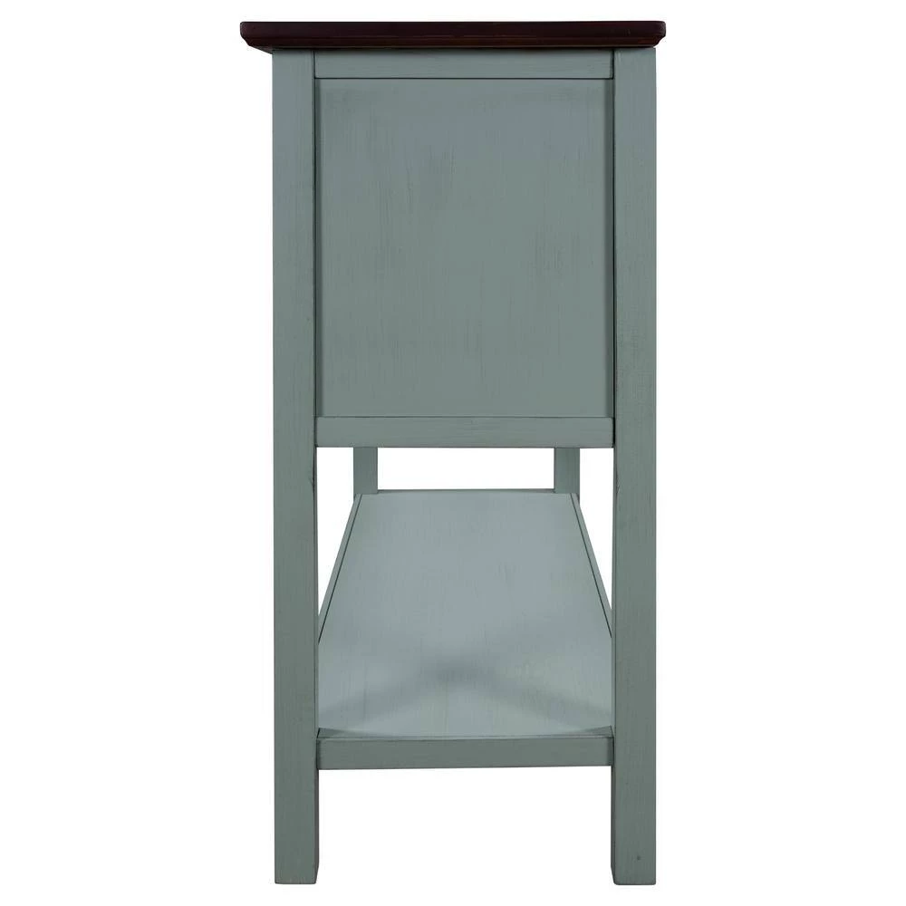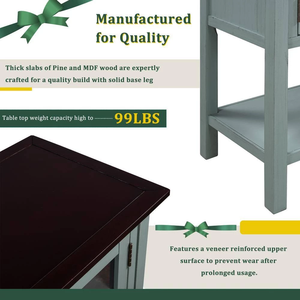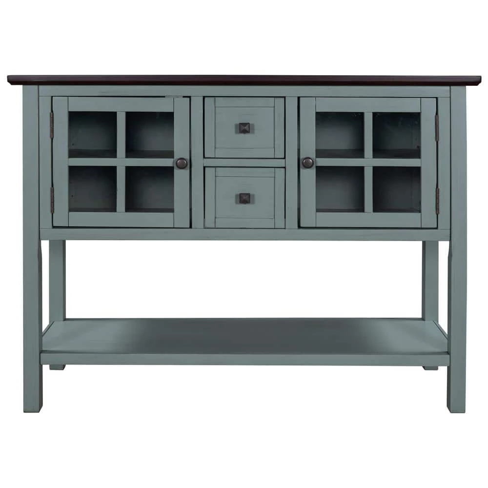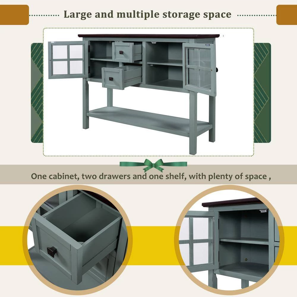 Effortlessly fill in that blank space in your home with this console table, designed to fit all of your needs and more. Crafted with a classic vintage appearance, this table comes complete with 2-front facing cabinet doors that open to reveal a spacious interior, perfect for stowing away your larger necessities and keeping them out of sight. The 2 matching compact-drawers minimize clutter, offering plenty of space to hold smaller items such as keys or mail while the spacious bottom shelf is the perfect place for storage baskets, shoes and more. Crafted with thick Pine and MDF wood slabs and accented with quality iron handles, this piece is manufactured for quality and exudes a high end appeal that will leave your guests talking.