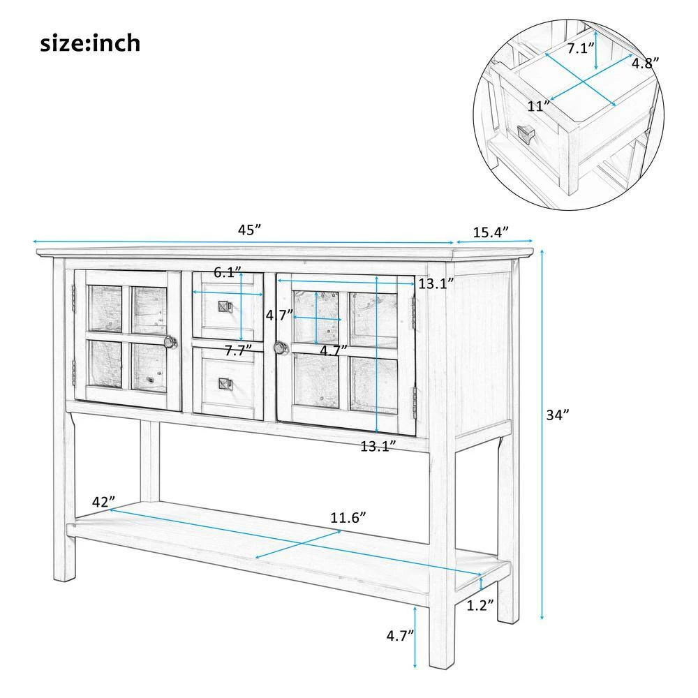 - High storage capacity, with built in shelving ranging from front double doors to 2 accent drawers, users will have plenty of space to store their belongings and avoid letting clutter accumulate on console table