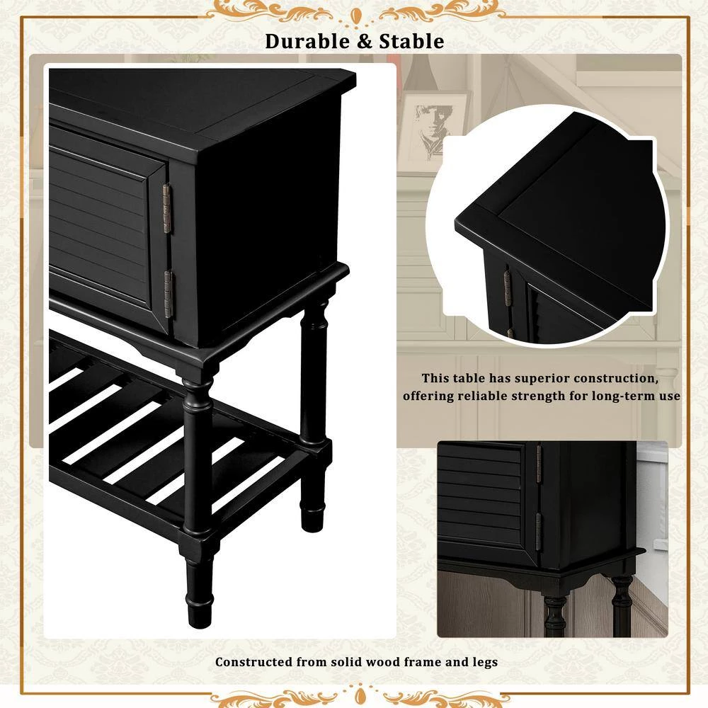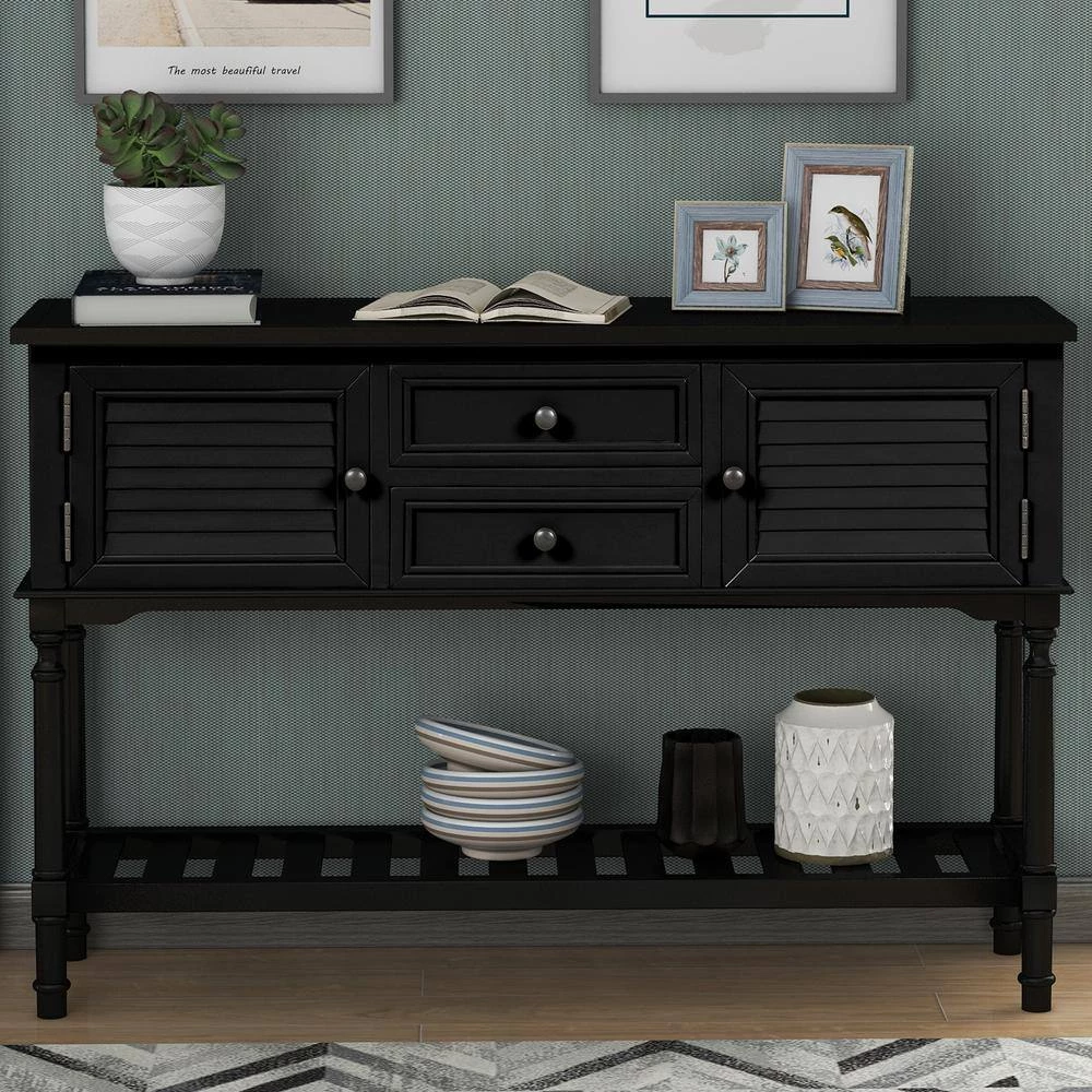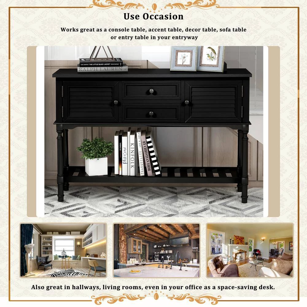 - Meet various storage needs, vintage console table functional designed to meet all kinds of storage demands are 2 drawers and cabinets to provide large storage space for your files, sundries and daily necessities and keep organized classic style console table has one open shelf to offer large holding power to support debrbasket, pot culture, books, etc top board can place your beautiful vase, cute photos and decorations, additional knickknacks or a lamp
