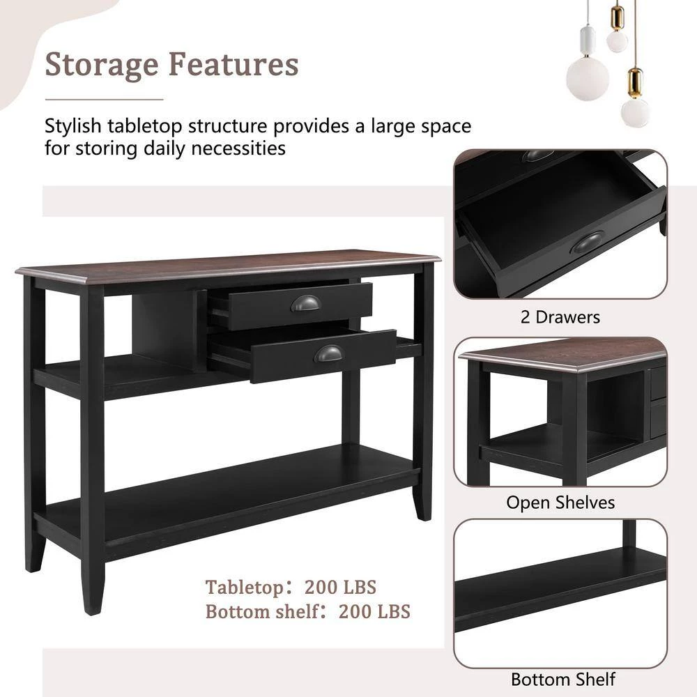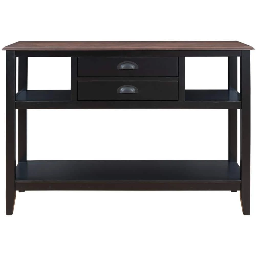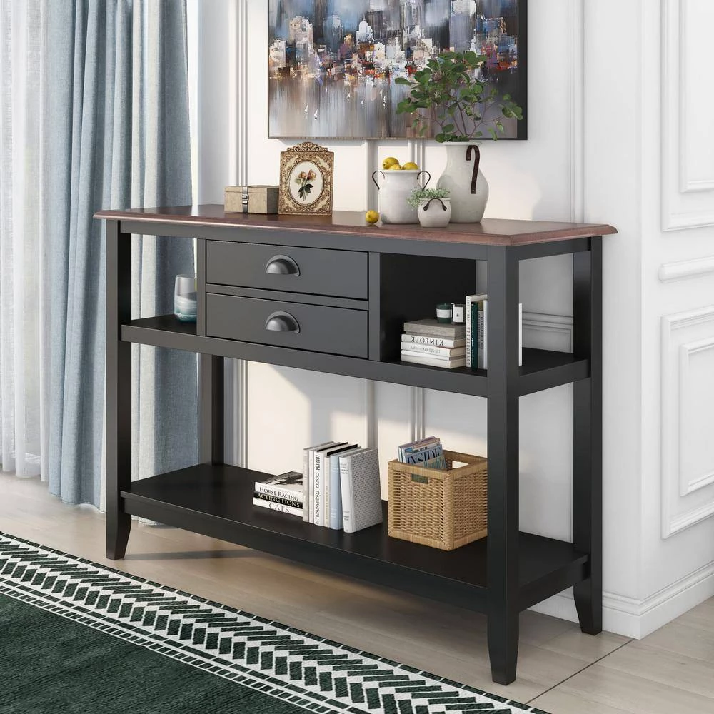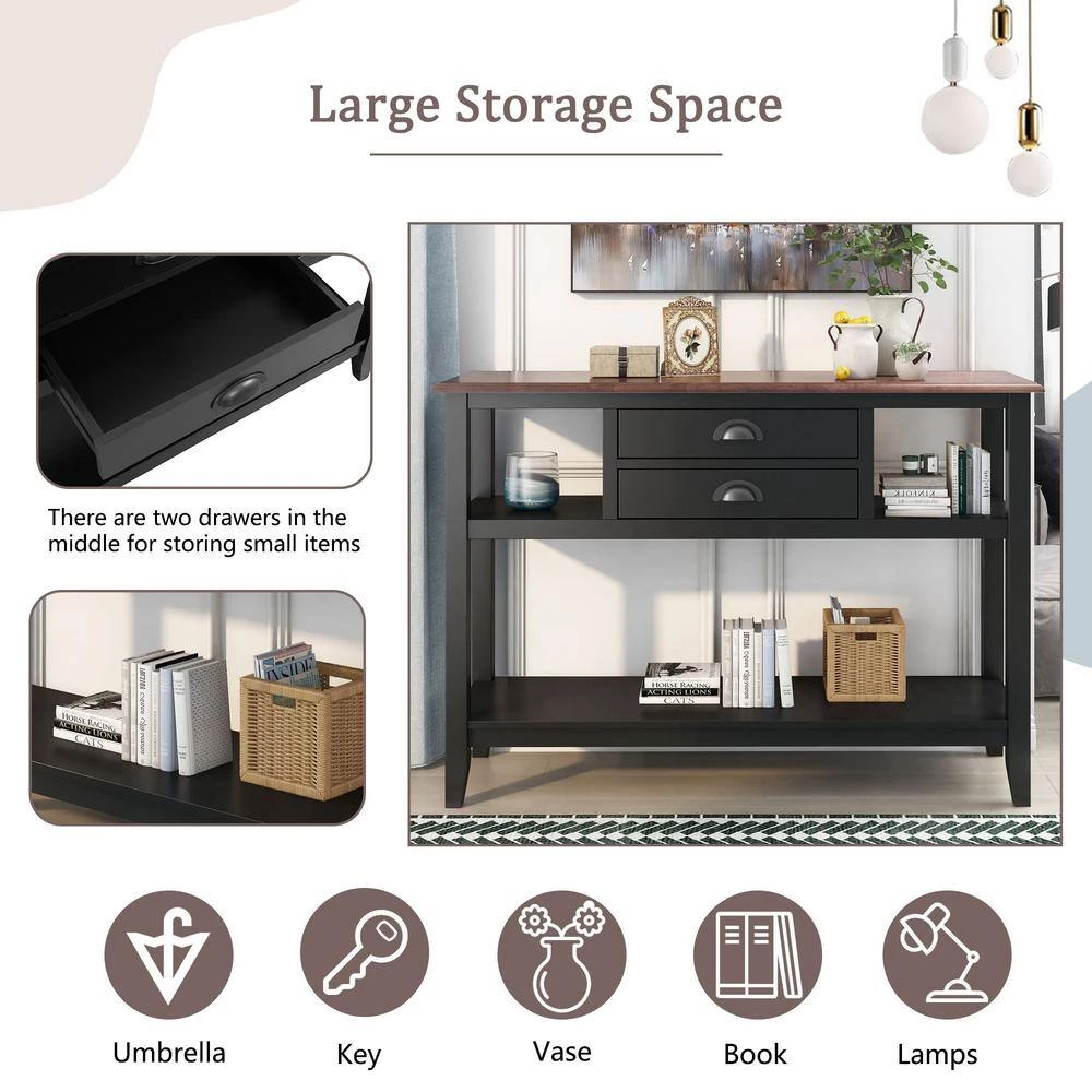 This Console table features open shelves plus 2-drawers providing ample storage space. The combination of wood structure and MDF will form a compact and practical furniture for your home. From the living room, family room to the entryway, this table is a great way to gain storage in almost any room in your home.