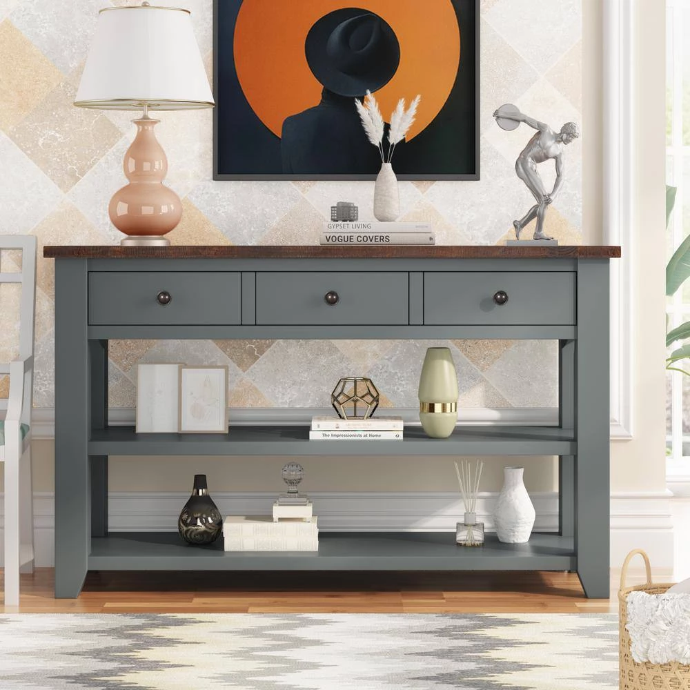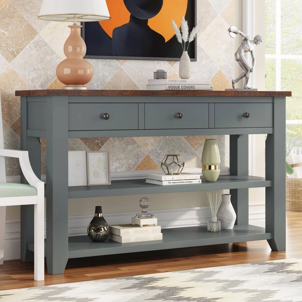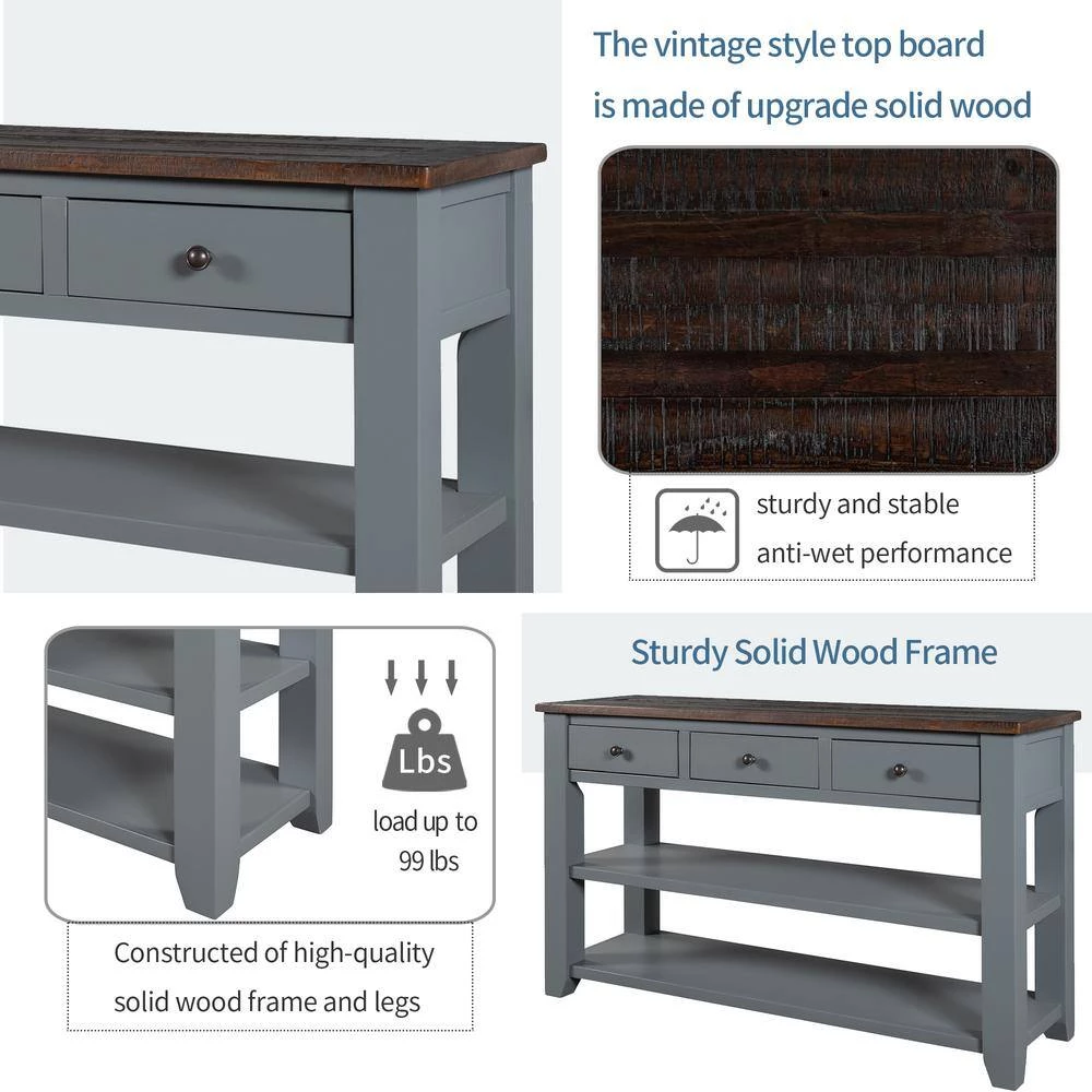 - [AMERICAN STYLE DESIGN]Our console table which is American style, simple and vintage, it will bring retro sentiment to your living area. tabletop surface has been deliberately aged with wood grain, and drawers got vintage style handles. It can be used as a commodity shelf to support pet stuff, compact umbrellas and daily essentials, or as a vintage book case to hold books and dictionaries, or magazines in hallway, bedroom and living room.