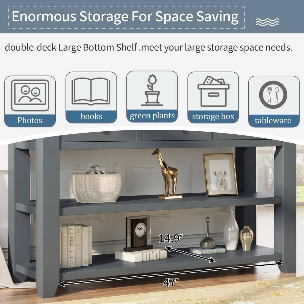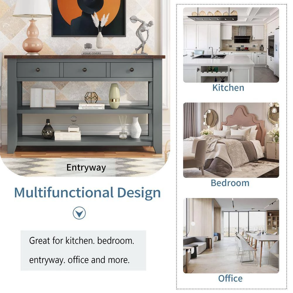 - [MEET YOUR VARIOUS STORAGE NEEDS]Our console table is functional designed, meet diversifying storage demands. There are three drawers at top to provide sufficient storage space for your files, daily necessities, sundries and keep organized. There are two shelves under drawer, which can support dictionaries, books, or pot culture, etc. Top board can place your favorite photos, vase, decorations, lamps or other knickknacks.