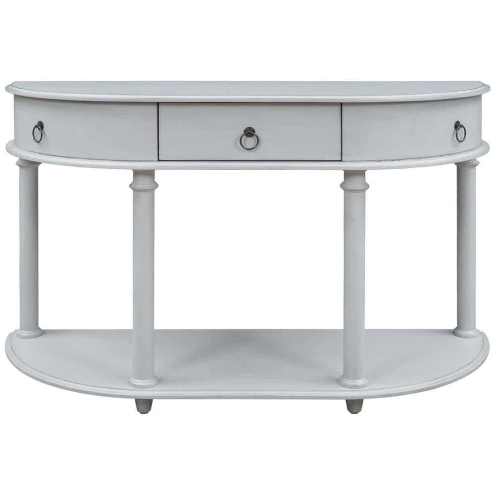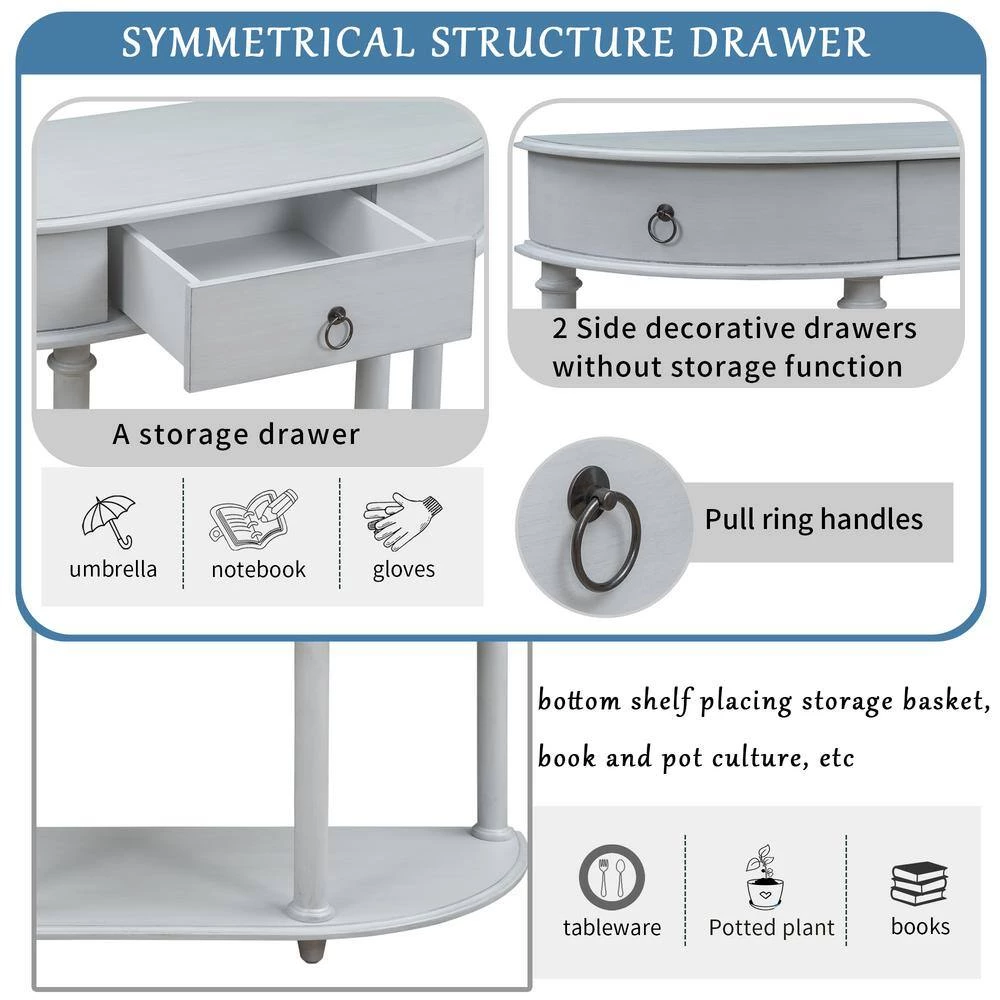 - Symmetric structure: There is a separate drawer under desktop, which can be used to store daily necessities like keys or books. pull-ring handles consistent with middle drawer are also designed on both sides, showing a symmetrical structure, which makes it look more harmonious and has a sense of design. Semi-circular outline, full of design sense, and four legs make structure more stable.