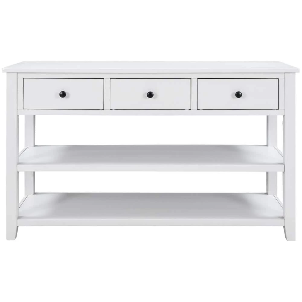 - 3 Drawers & 2 Layers Shelves: There are 3 drawers set under tabletop to offer large room for storing daily necessities or files, and so on. You can keep daily sundries out of your sight to ensure your home clean and tidy. Round retro handles with fine craftsmanship shows a delicate and elegant life attitude. As a practical console table, open style shelf is a vital element. setting of 2 open shelves meet requirements of placing storage basket, books, pot culture, etc.