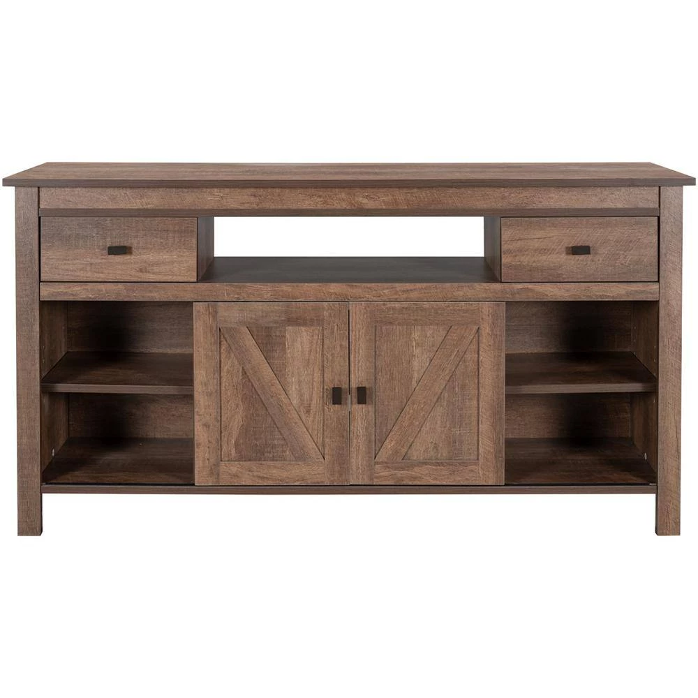 In order to meet the requirements of user’s daily life, this modern and stylish design TV stand has a standard and practical layout. The layout configuration aspect has two main parts: the upper level has two drawers at both ends and an open storage space in the middle; the lower level has two sliding doors and three adjustable height shelves in the middle. Thus, user can find the right place to support the equipment. The handles for two drawers have rectangular design, and they are made of metal. They are looked simple and elegant and comfortable to touch as well. Sliding rails is the accessory of sliding doors is made of metal to guarantee smooth using experience and the long-term duration. The adjustable shelf is particle board with bearing devices on both sides to ensure the sufficient load-bearing capacity.