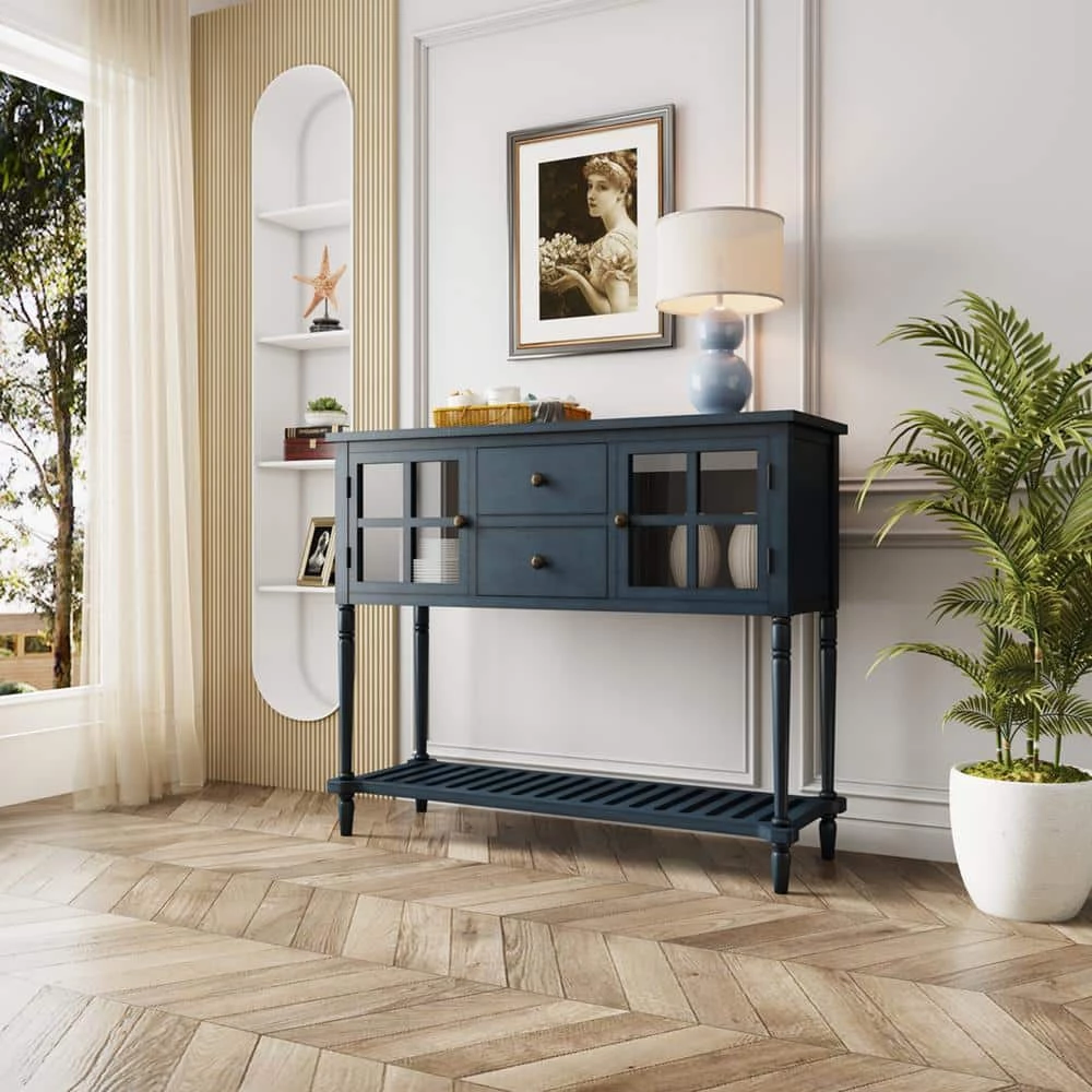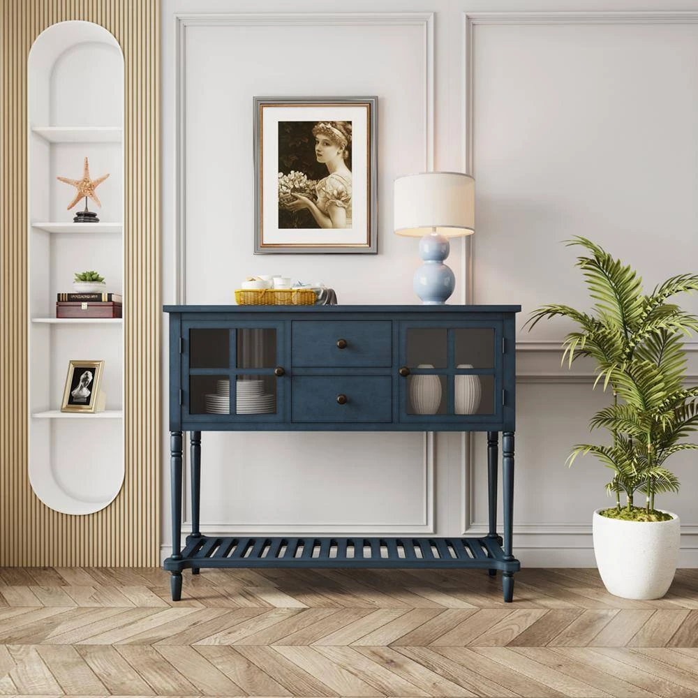 Effortlessly fill in that blank space in your home with this console table, designed to fit all of your needs and more. Crafted with a classic vintage appearance, this table comes complete with two front facing cabinet doors that open to reveal a spacious interior, perfect for stowing away your larger necessities and keeping them out of sight. The drawers minimize clutter, offering plenty of space to hold smaller items such as keys or mails while the spacious bottom shelf is the perfect place for storage baskets, shoes and more. Crafted with thick Pine and MDF wood slabs and accented with quality iron handles, this piece is manufactured for quality and exudes a high-end appeal that will leave your guests talking.