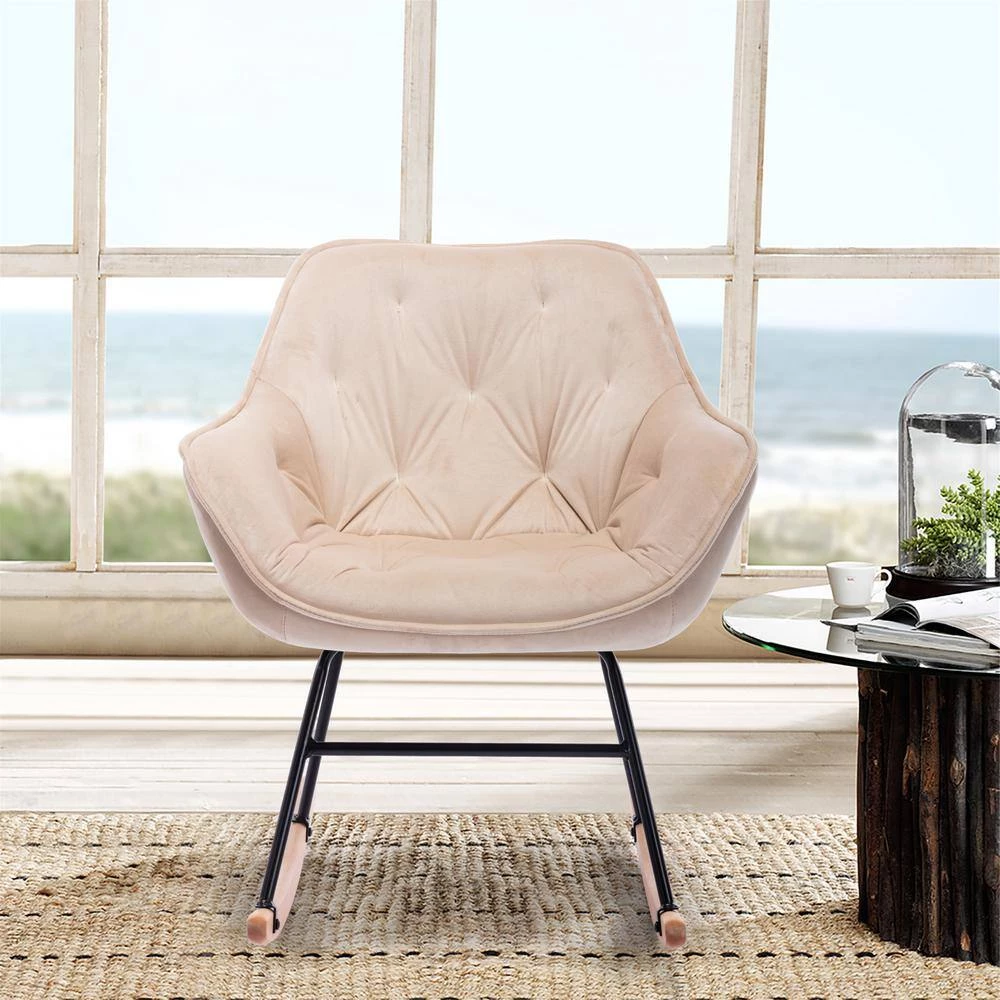 The Designs rocking chair provides a chic place to sip a cup of coffee, dive into a fabulous book, or just whittle away the time comfortably. The entire frame is made of solid wood which is sturdy enough to support up to 300 lbs. Covered with high quality fabric and filled with high density and soft sponges.