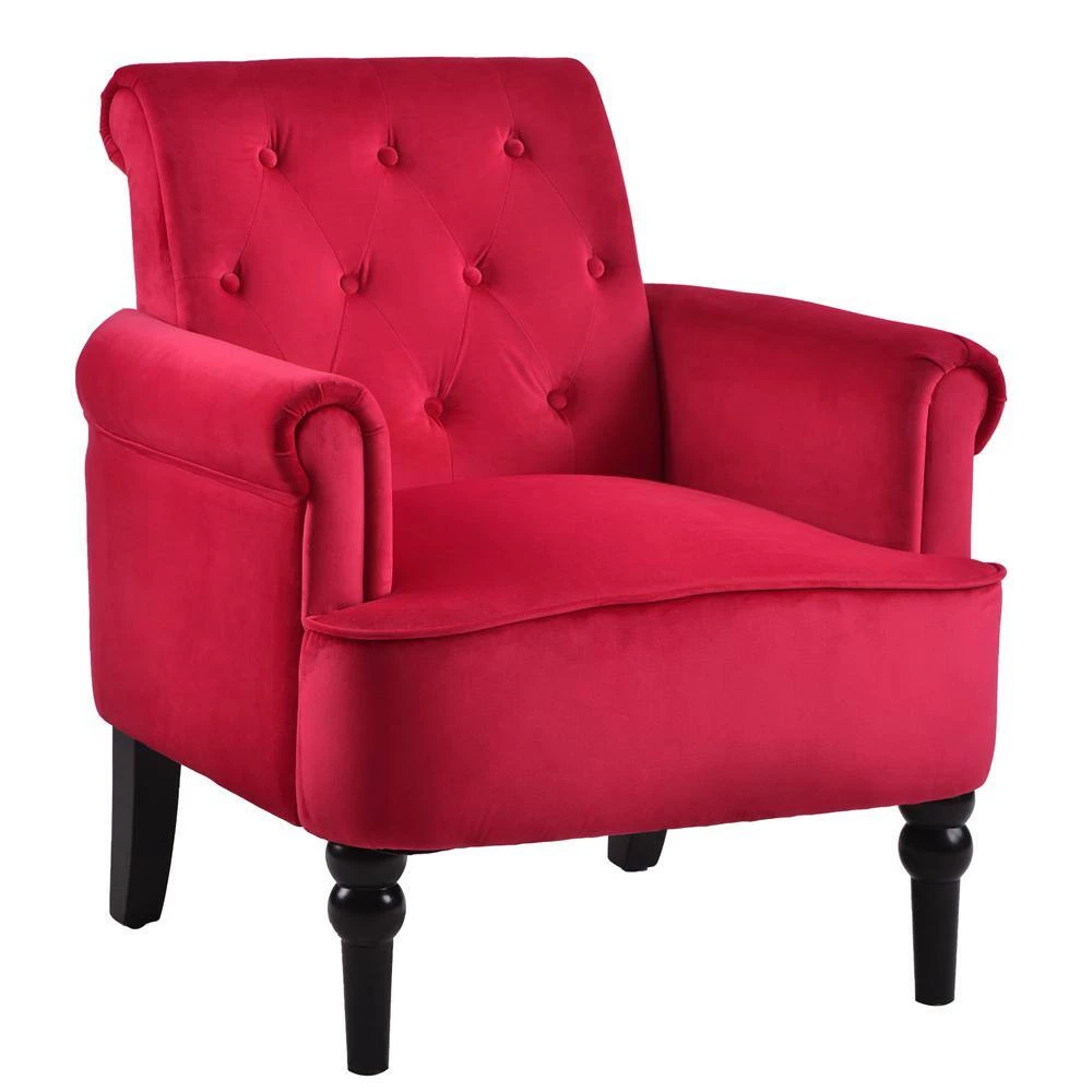 - The chair features a squared button tufted back design with round arms and leg for added detail.