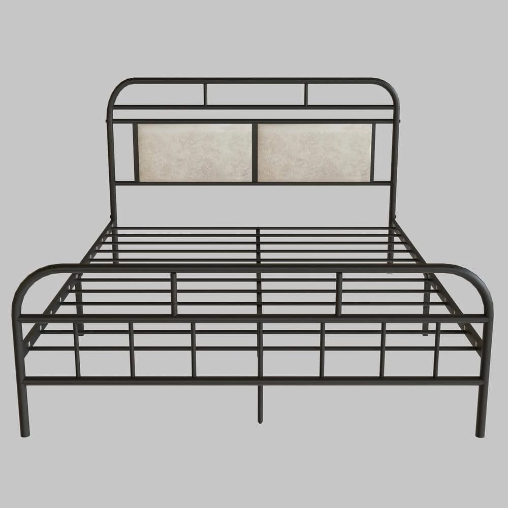 For lovers of convenience and clean-cut style, this elegant Metal Platform Bed is a-Piece that checks all the boxes. This functional metal frame makes a seamless addition to any space, with its bold black metal, simple lines and foolproof assembly system that makes setup an absolute breeze. The beige upholstered headboard lends a touch of softness to the steel bed frame, and gives your bedroom.a more personal feel. In fact, the entire thing comes together without any nuts or bolts in less than 30 minutes. And after pulling it off in record time, you’re left with a bed that’s sturdily engineered to support your mattress on top of its wood platform without a box spring. And if all that weren’t enough, you can also use this ingenious frame to store more under the bed than ever before with its 11. 8 in. of clearance space. This Steel Platform Bed Frame with Headboard is the perfect solution for the modern minimalists.