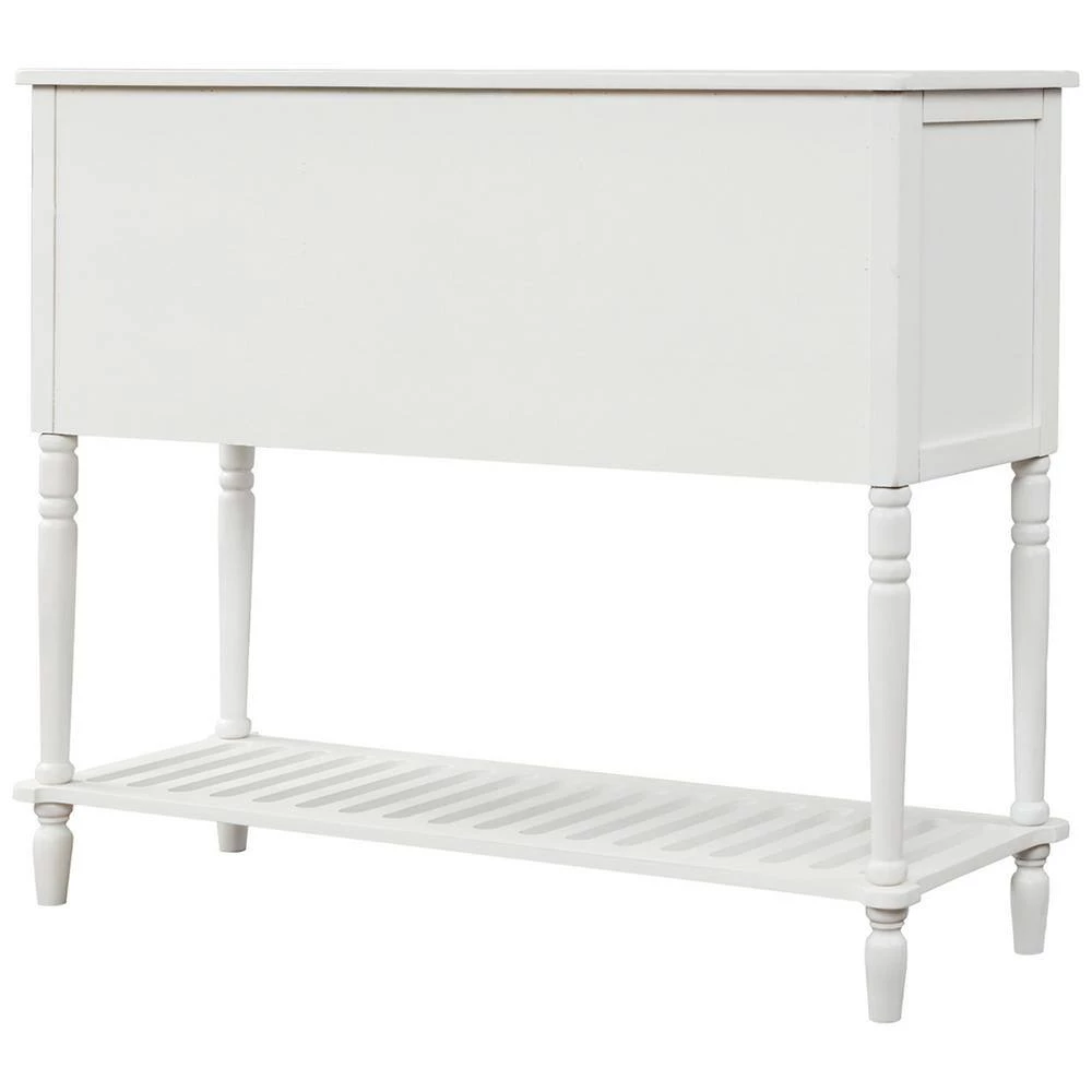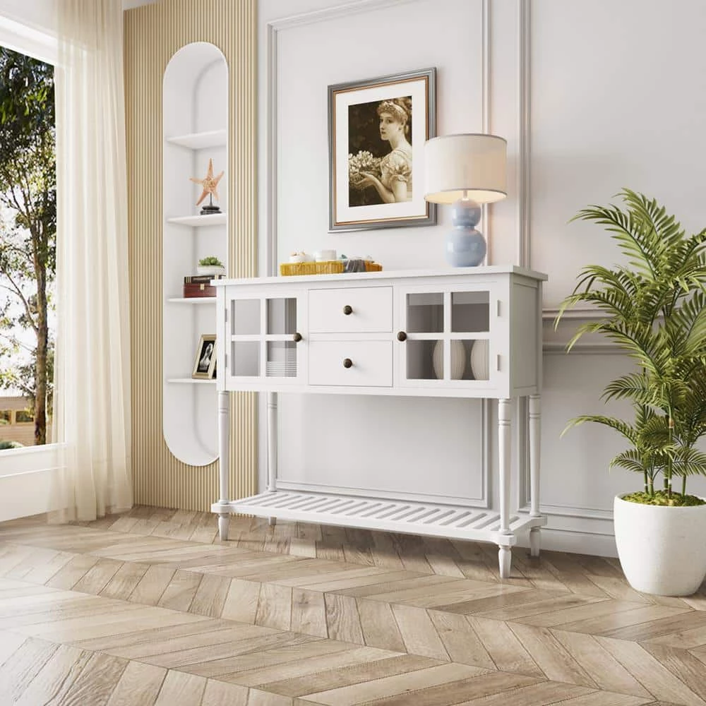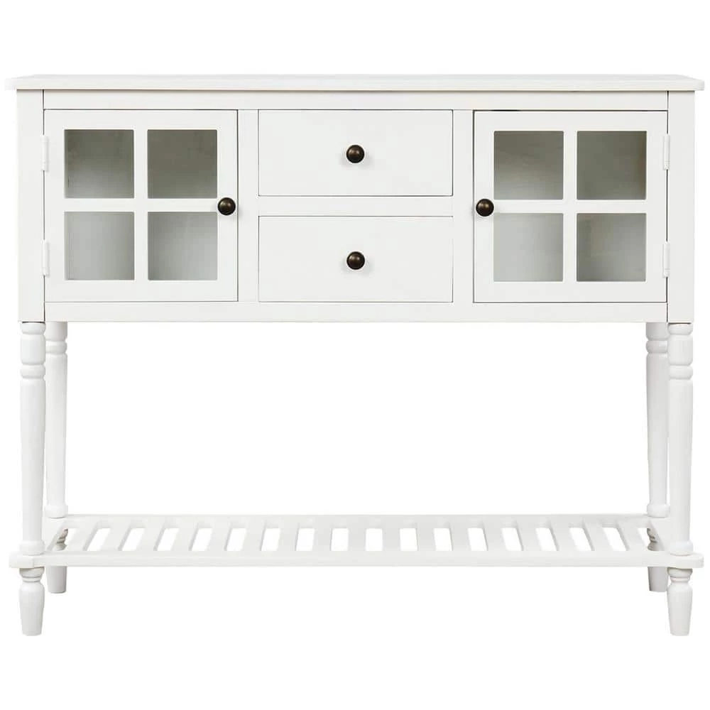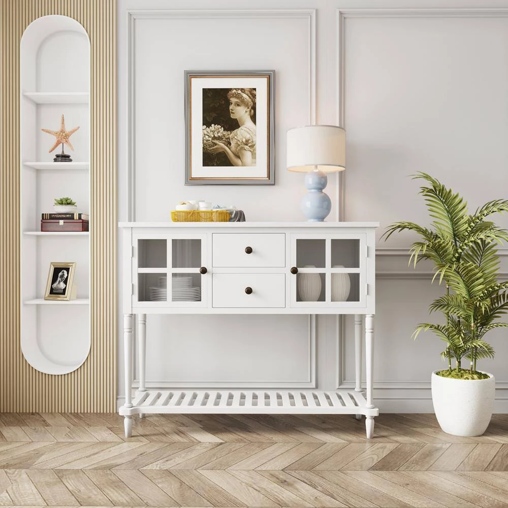 Effortlessly fill in that blank space in your home with this console table, designed to fit all of your needs and more. Crafted with a classic vintage appearance, this table comes complete with two front facing cabinet doors that open to reveal a spacious interior, perfect for stowing away your larger necessities and keeping them out of sight. The drawers minimize clutter, offering plenty of space to hold smaller items such as keys or mails while the spacious bottom shelf is the perfect place for storage baskets, shoes and more. Crafted with thick Pine and MDF wood slabs and accented with quality iron handles, this piece is manufactured for quality and exudes a high-end appeal that will leave your guests talking.