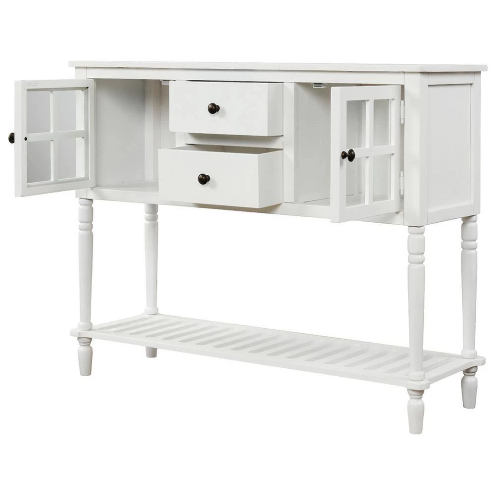- With built in shelving ranging from the front double doors to the 2 drawers, users will have plenty of space to store their belongings and avoid letting clutter accumulate on the console table.