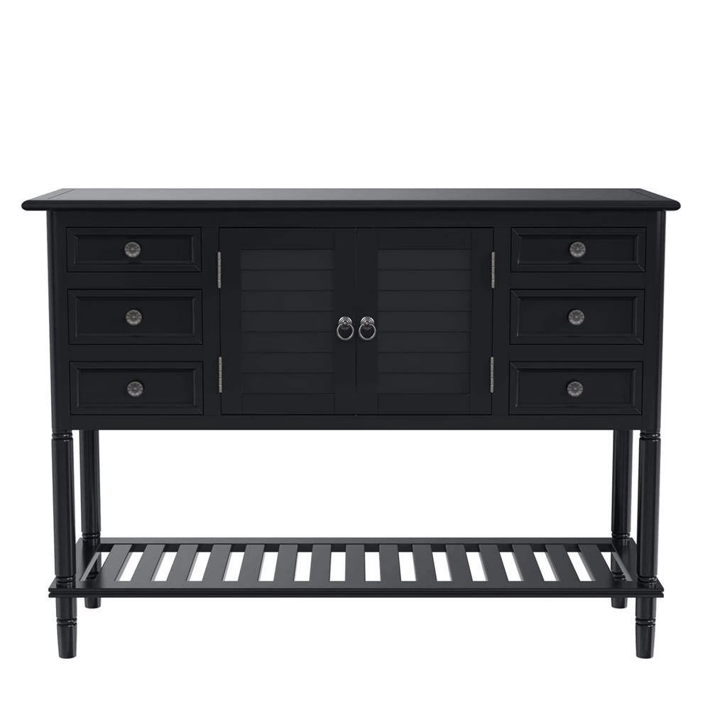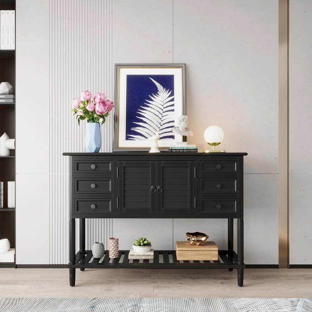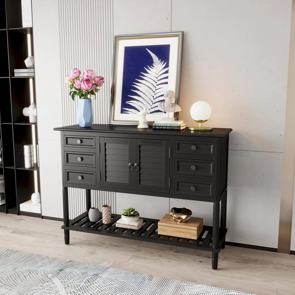 - With built in shelving ranging from the front double doors to the 6 drawers, users will have plenty of space to store their belongings and avoid letting clutter accumulate on the console table.