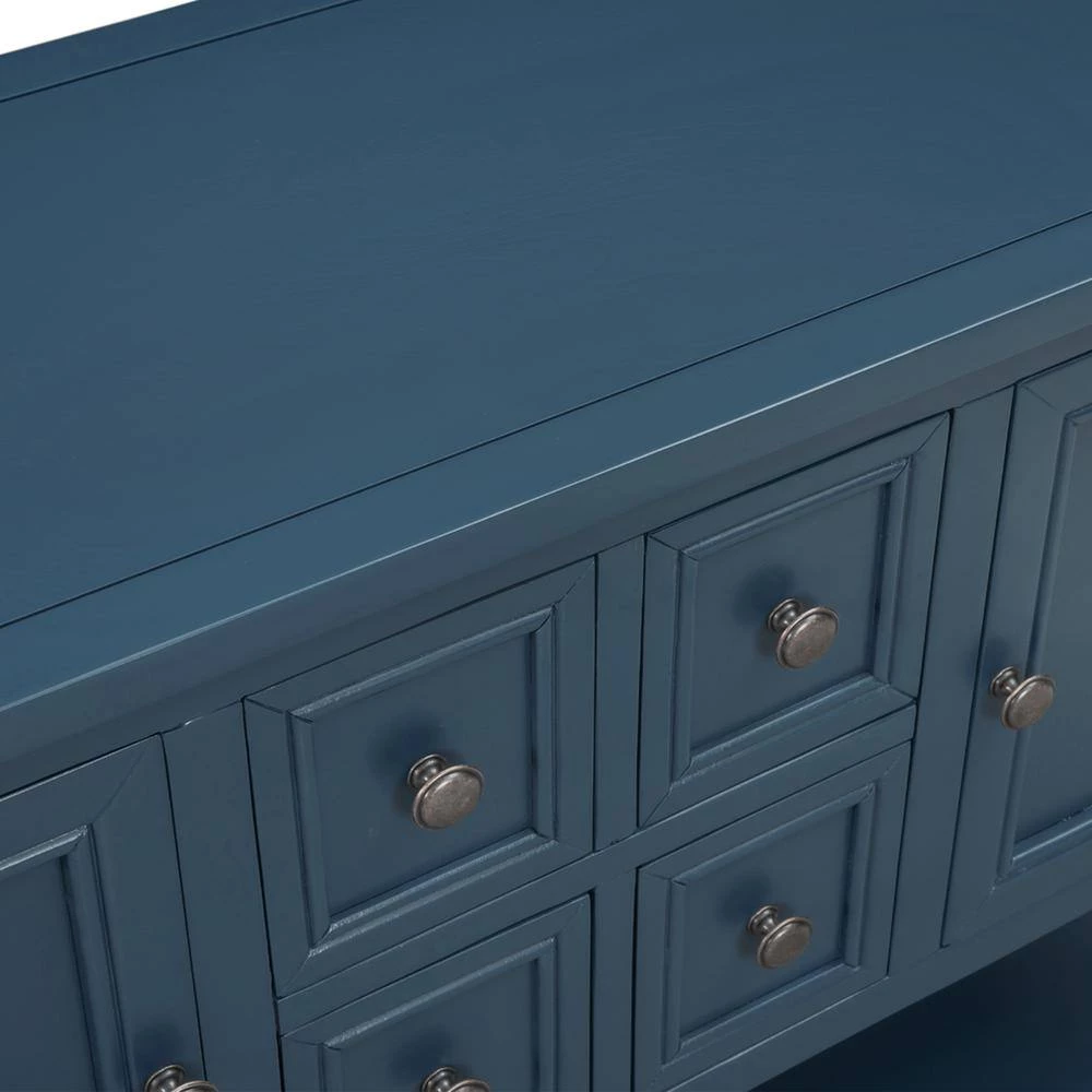 - Sideboard table comes complete with four storage drawers, two cabinets and bottom shelf.