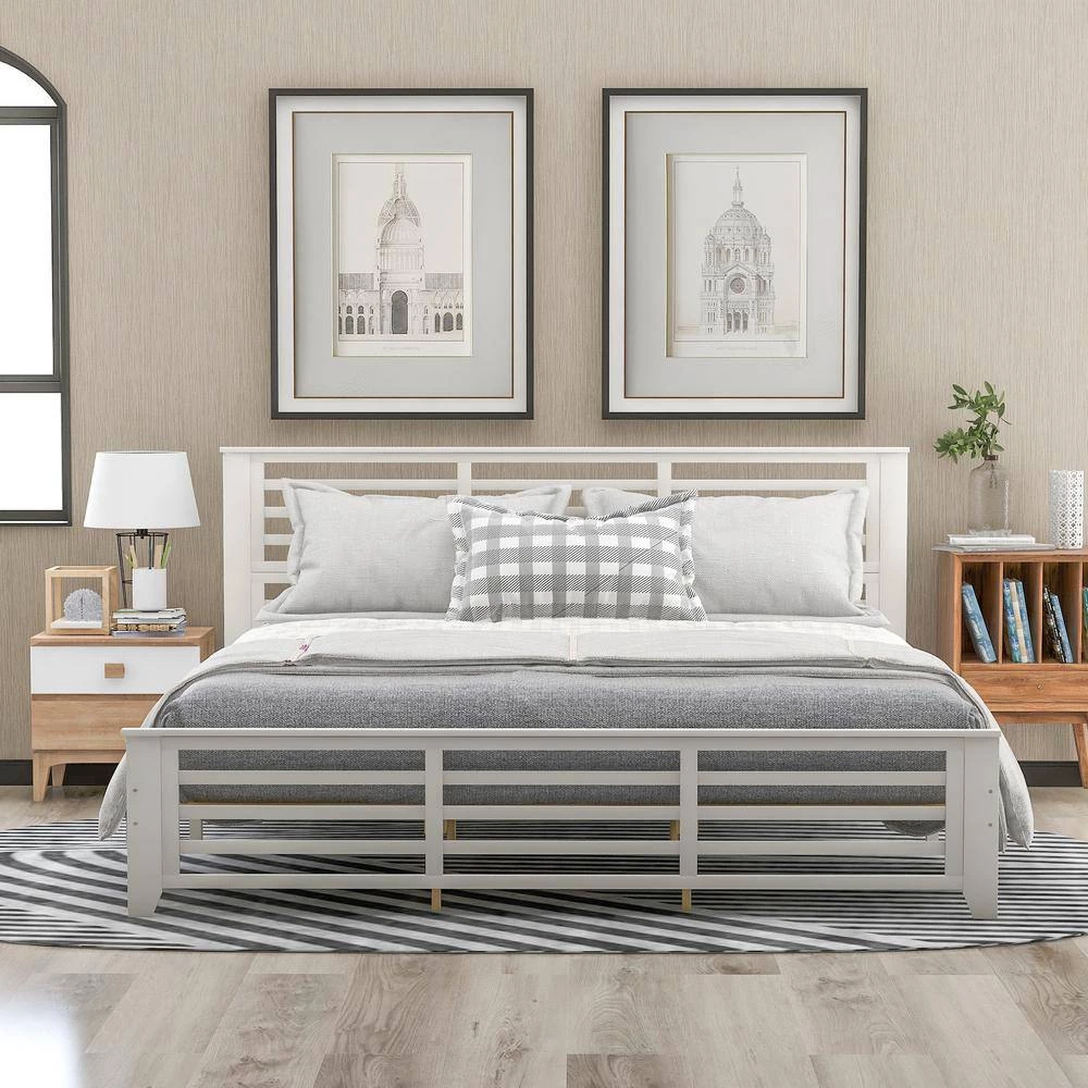 The shape of this platform bed is simple and fashionable. The head and foot boards are hollowed out, and the bed frame has a cut surface design. This bed is suitable for any decoration style. The strong board is very durable. The support legs in the middle of the bed increase the weight capacity of the bed.