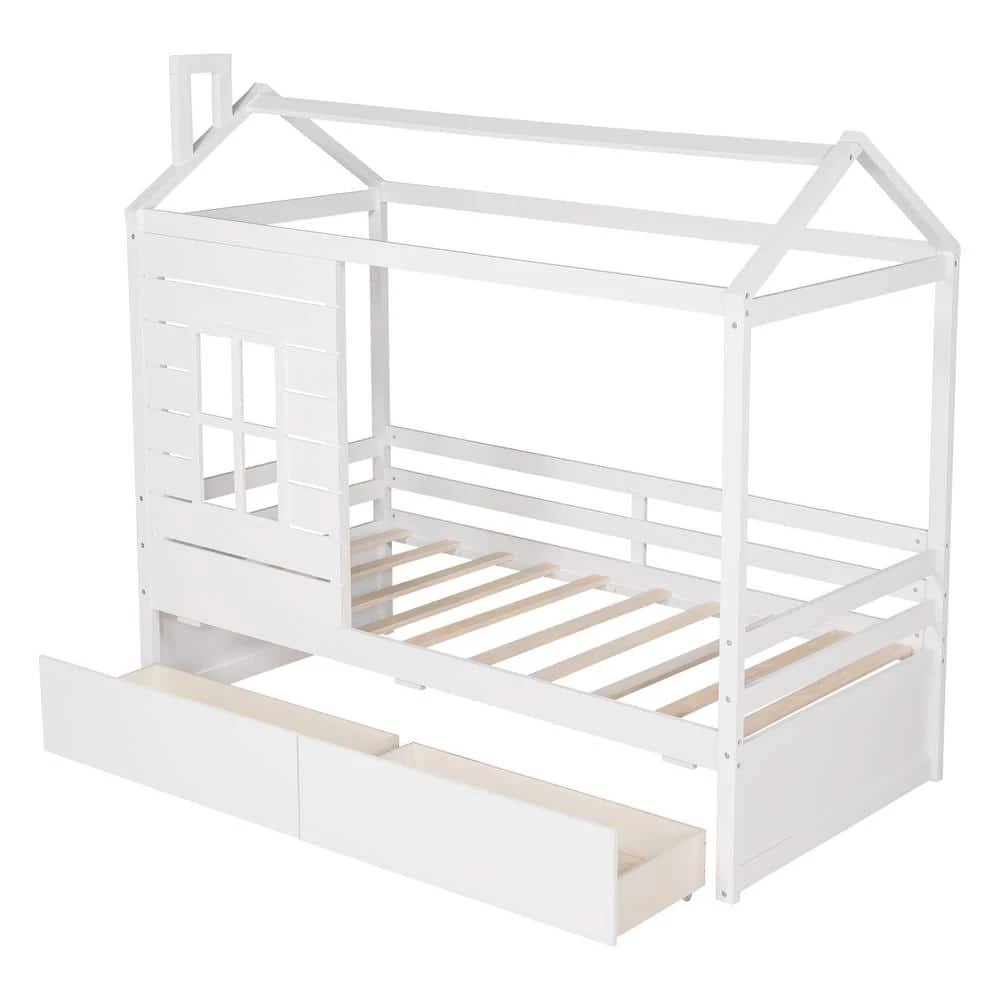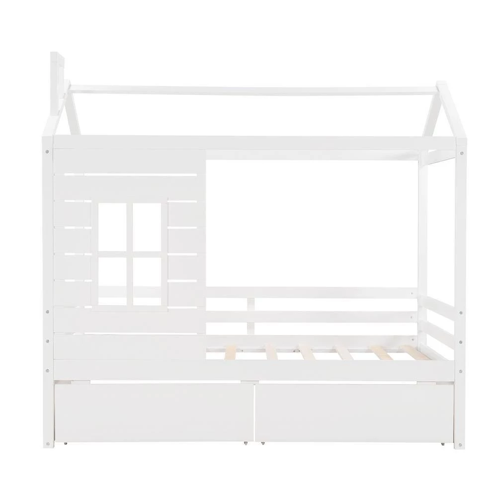 Take your children’s bedroom.to the next level with this Twin Size House Bed with 2-Drawers that not only saves space, but creates an exciting atmosphere for your kids. Featuring a playhouse in. spired window, this bed doubles as a semi-enclosed play place perfect for kids to study, watch TV or explore their imaginations. Enjoy this bed for years to come with its durable build, manufactured with quality lumber and pinewood to withstand horseplay, scratching and other untimely wear. Comes complete with thick slats to preserve the life of your mattress.